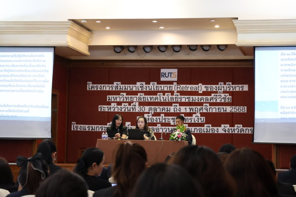 ระหว่างวันที่ 30 ตุลาคม – 1 พฤศจิกายน 2568 มหาวิทยาลัยเทคโนโลยีราชมงคลศรีวิชัย นำโดย ศาสตราจารย์ ดร.สุวัจน์ ธัญรส อธิการบดี พร้อมด้วยคณะผู้บริหารมหาวิทยาลัย เข้าร่วม “โครงการสัมมนาเชิงนโยบาย (Retreat) ผู้บริหารมหาวิทยาลัยเทคโนโลยีราชมงคลศรีวิชัย” ณ กระบี่รีสอร์ท อ่าวนาง จังหวัดกระบี่ โดยมีวัตถุประสงค์เพื่อเปิดโอกาสให้ผู้บริหารมหาวิทยาลัยได้แลกเปลี่ยนความคิดเห็นทางวิชาการและเชิงนโยบาย ตลอดจนทบทวนและปรับปรุงข้อบังคับและระเบียบต่าง ๆ ของมหาวิทยาลัยให้มีความเหมาะสม ทันสมัย และสอดคล้องกับบริบทการพัฒนาในปัจจุบัน เพื่อเพิ่มประสิทธิภาพและความคล่องตัวในการบริหารจัดการองค์กร รวมถึงสร้างความสัมพันธ์อันดีระหว่างผู้บริหาร เพื่อเสริมสร้างความสามัคคีและความร่วมมือภายในองค์กร อันจะนำไปสู่การพัฒนาอย่างยั่งยืนในอนาคต