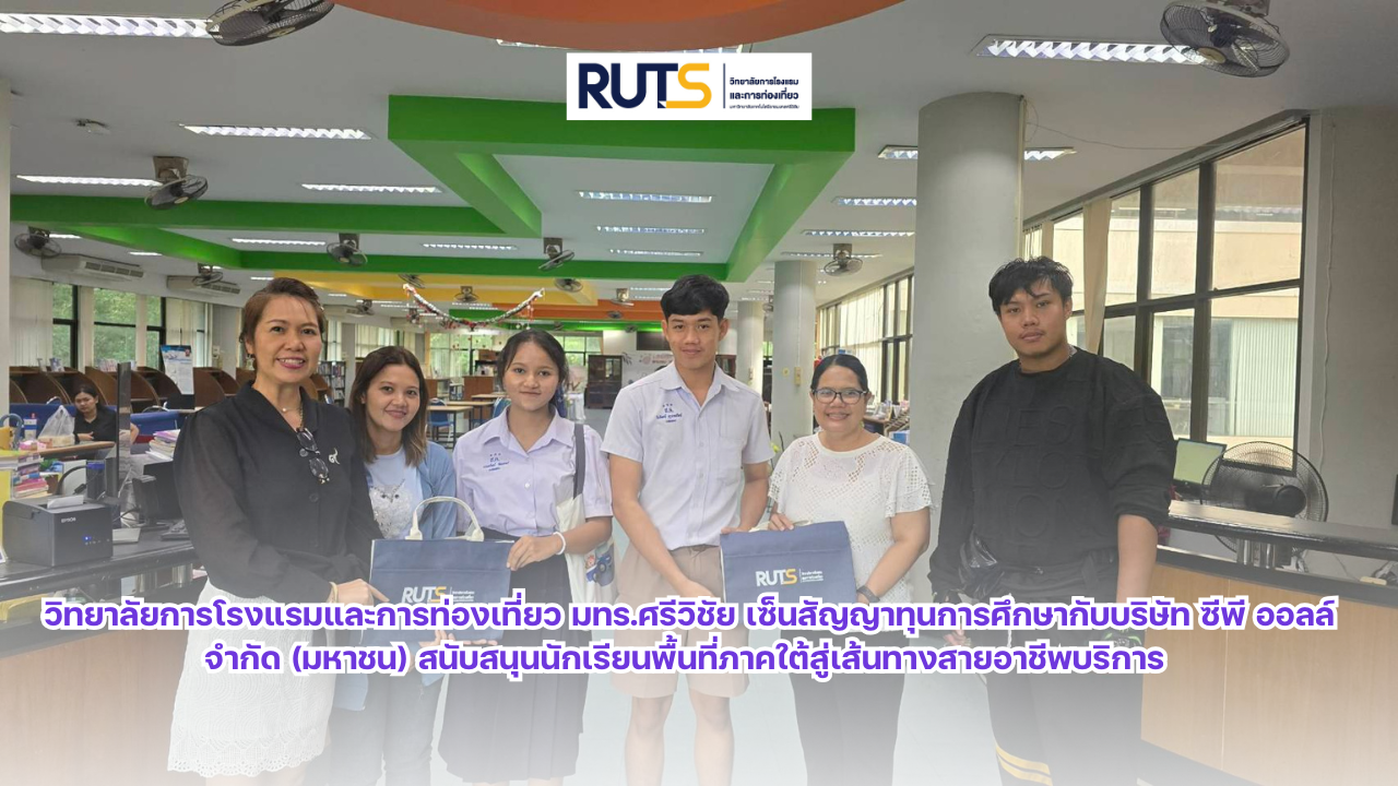 ระหว่างเดือนตุลาคม – พฤศจิกายน 2568 ผู้ช่วยศาสตราจารย์นุชนาถ ทับครุฑ ประธานหลักสูตรสาขาวิชาการจัดการและการพัฒนาธุรกิจ พร้อมด้วยคณาจารย์ประจำหลักสูตร วิทยาลัยการโรงแรมและการท่องเที่ยว มหาวิทยาลัยเทคโนโลยีราชมงคลศรีวิชัย วิทยาเขตตรัง ได้ดำเนินการลงนามสัญญาทุนการศึกษาจำนวน 7 ทุน ภายใต้ โครงการความร่วมมือระหว่างบริษัท ซีพี ออลล์ จำกัด (มหาชน) และ วิทยาลัยการโรงแรมและการท่องเที่ยว