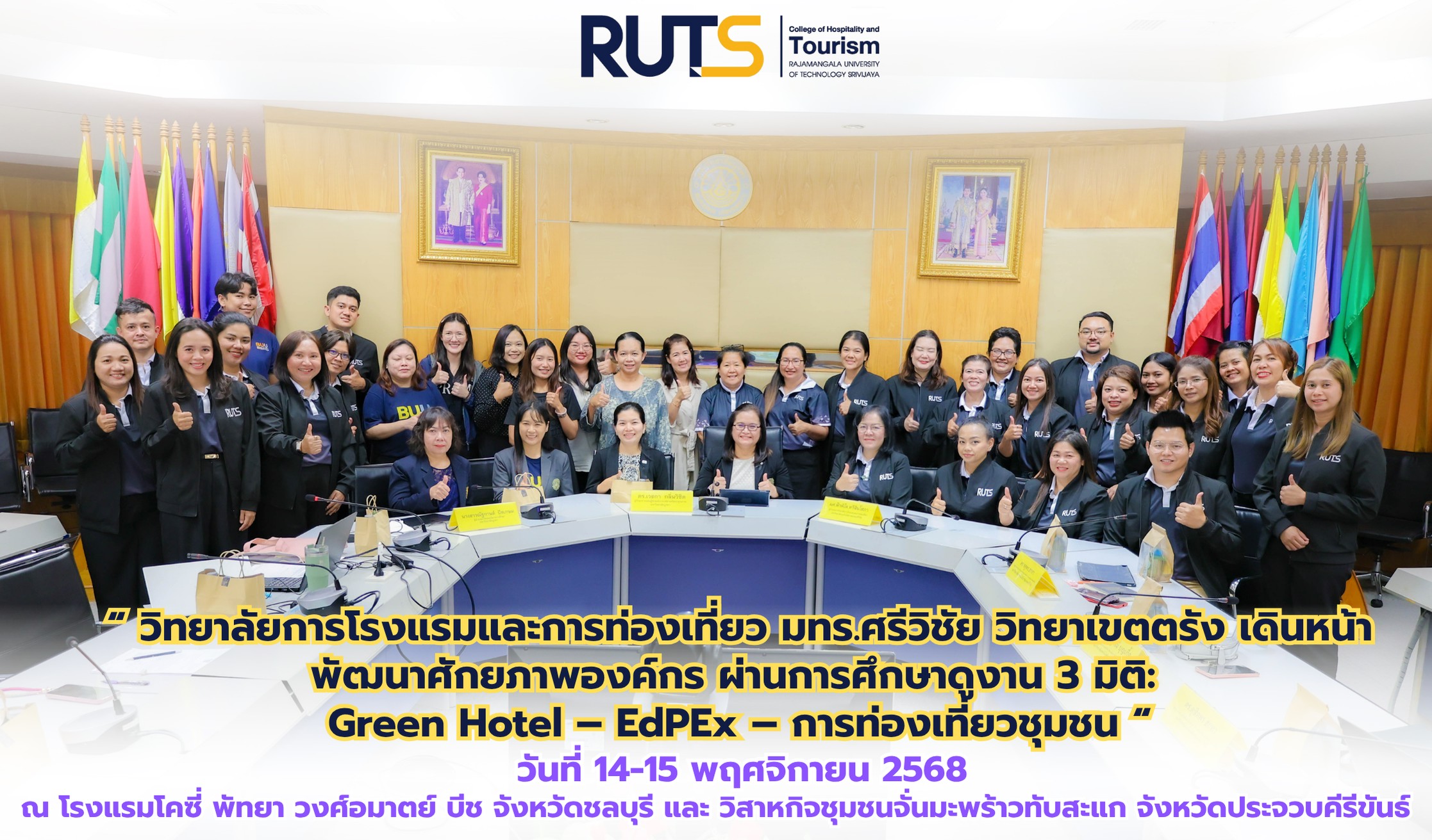 ระหว่างวันที่ 14 – 15 พฤศจิกายน 2568 วิทยาลัยการโรงแรมและการท่องเที่ยว มหาวิทยาลัยเทคโนโลยีราชมงคลศรีวิชัย วิทยาเขตตรัง นำโดย ผู้ช่วยศาสตราจารย์ฟ้าพิไล ทวีสินโสภา ผู้อำนวยการวิทยาลัยการโรงแรมและการท่องเที่ยว พร้อมด้วยคณะผู้บริหาร คณาจารย์ และบุคลากร เดินทางศึกษาดูงานในพื้นที่จังหวัดชลบุรี และประจวบคีรีขันธ์ เพื่อพัฒนาศักยภาพบุคลากร ยกระดับคุณภาพการบริหารจัดการ และเสริมสร้างองค์ความรู้ด้านการท่องเที่ยวและการบริการให้สอดคล้องกับมาตรฐานสากล ตลอดจนสนับสนุนการพัฒนาภารกิจหลักของสถาบัน ทั้งด้านการจัดการเรียนการสอน การวิจัย และการบริการวิชาการแก่ชุมชนอย่างยั่งยืนการศึกษาดูงานเริ่มต้นที่ โรงแรมโคซี่ พัทยา วงศ์อมาตย์ บีช จังหวัดชลบุรี เพื่อเรียนรู้การดำเนินงานของโรงแรมที่มุ่งเน้นแนวคิด Green Hotel ทั้งด้านการจัดการพลังงาน การลดของเสีย การใช้ทรัพยากรอย่างมีประสิทธิภาพ รวมถึงระบบการบริหารจัดการโรงแรมที่ใส่ใจสิ่งแวดล้อมและสังคมในพื้นที่ โดยคณะผู้ศึกษาดูงานได้แลกเปลี่ยนประสบการณ์กับผู้บริหารโรงแรม เพื่อนำองค์ความรู้มาประยุกต์ใช้ในการพัฒนาหลักสูตรและกิจกรรมการเรียนรู้ของนักศึกษาให้ทันต่อแนวโน้มอุตสาหกรรมบริการยุคใหม่