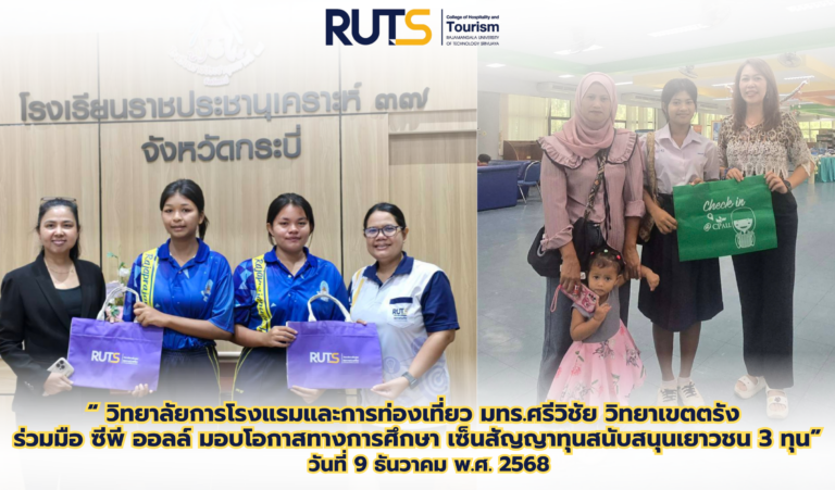 วันที่ 19 พฤศจิกายน 2568 วิทยาลัยการโรงแรมและการท่องเที่ยว มหาวิทยาลัยเทคโนโลยีราชมงคลศรีวิชัย ดำเนินกิจกรรมแนะแนวประชาสัมพันธ์หลักสูตร เพื่อเตรียมรับสมัครนักศึกษาใหม่ประจำปีการศึกษา 2569 โดยมีผู้ช่วยศาสตราจารย์นุชนาถ ทับครุฑ ประธานหลักสูตรบริหารธุรกิจบัณฑิต สาขาวิชาการจัดการและการพัฒนาธุรกิจ พร้อมด้วยนางสาวกรวิษา ร่มรื่น หัวหน้าหน่วยทะเบียนและวัดผล ร่วมเป็นวิทยากรให้ข้อมูลแก่นักเรียนระดับชั้นมัธยมศึกษา