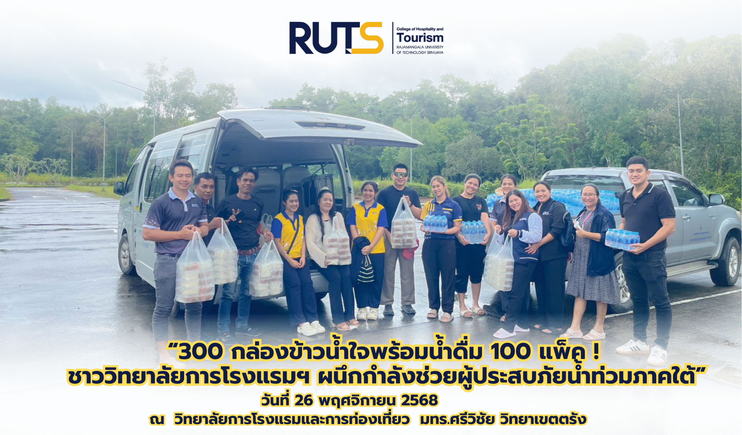 วันที่ 26 พฤศจิกายน 2568 ณ วิทยาลัยการโรงแรมและการท่องเที่ยว มหาวิทยาลัยเทคโนโลยีราชมงคลศรีวิชัย คณาจารย์ บุคลากร และนักศึกษา ได้ร่วมแรงร่วมใจจัดทำและส่งต่อ “กล่องข้าวน้ำใจ” จำนวน 300 กล่อง และน้ำดื่ม 100 แพ็คเพื่อเป็นกำลังใจแก่ผู้ประสบภัยน้ำท่วมในพื้นที่ภาคใต้ โดยได้มีการเตรียมวัตถุดิบและจัดเตรียมอุปกรณ์ต่าง ๆ ตั้งแต่วันที่ 25 พฤศจิกายน 2568
