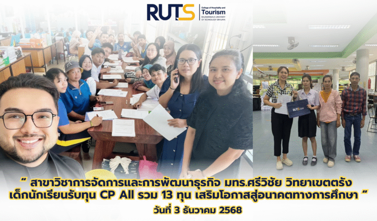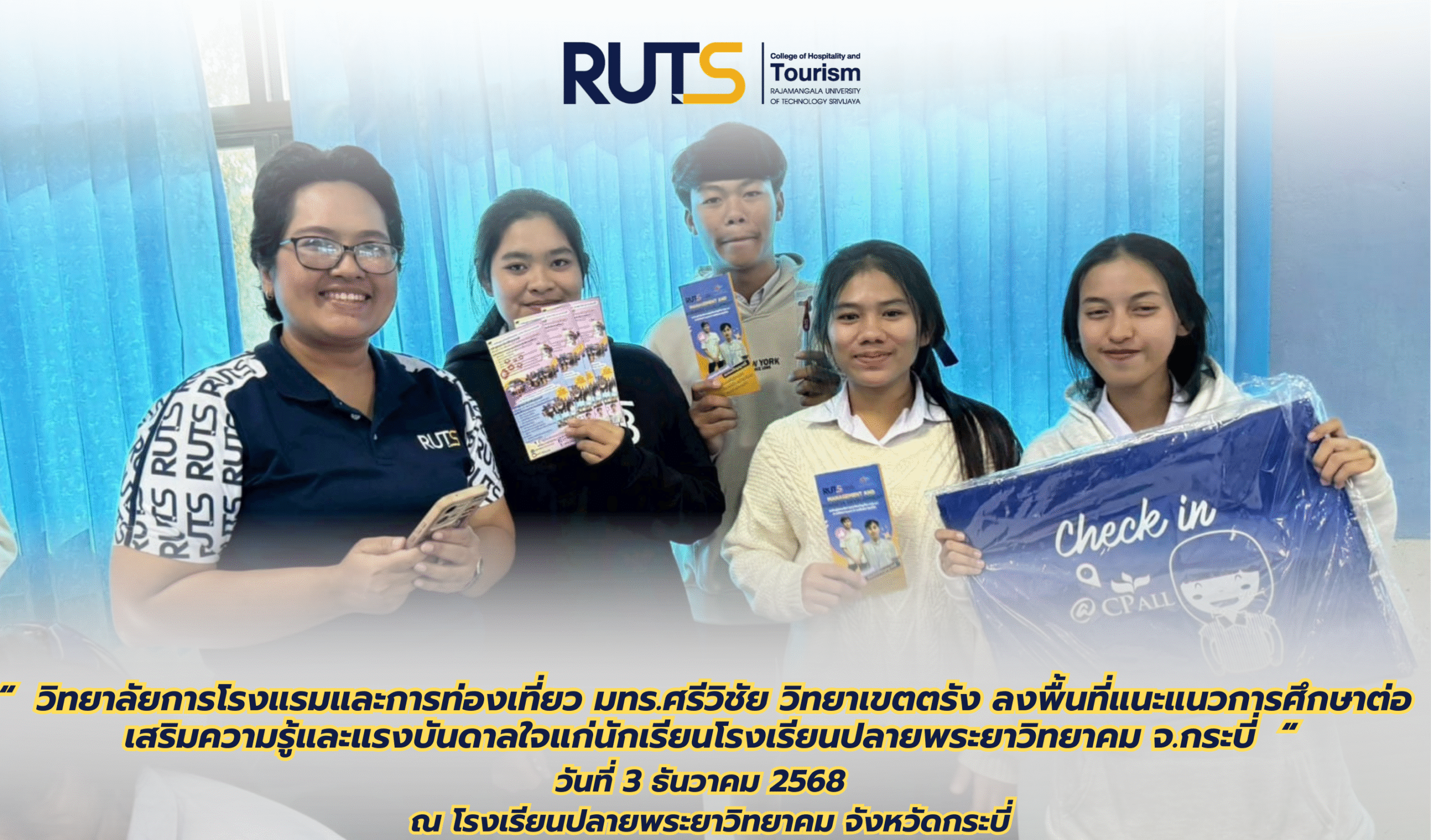 วันที่ 3 ธันวาคม 2568 ณ โรงเรียนปลายพระยาวิทยาคม จังหวัดกระบี่ วิทยาลัยการโรงแรมและการท่องเที่ยว มหาวิทยาลัยเทคโนโลยีราชมงคลศรีวิชัย วิทยาเขตตรัง นำโดย นางสาวกรวิษา ร่มรื่น หัวหน้าหน่วยทะเบียนและวัดผล พร้อมทีมงาน ได้ลงพื้นที่จัดกิจกรรมแนะแนวการศึกษาต่อให้แก่นักเรียนระดับมัธยมศึกษา เพื่อส่งต่อข้อมูลด้านการเรียนในระดับอุดมศึกษา เปิดมุมมองใหม่ ๆ และช่วยให้นักเรียนสามารถวางแผนเส้นทางการศึกษาได้อย่างเหมาะสม