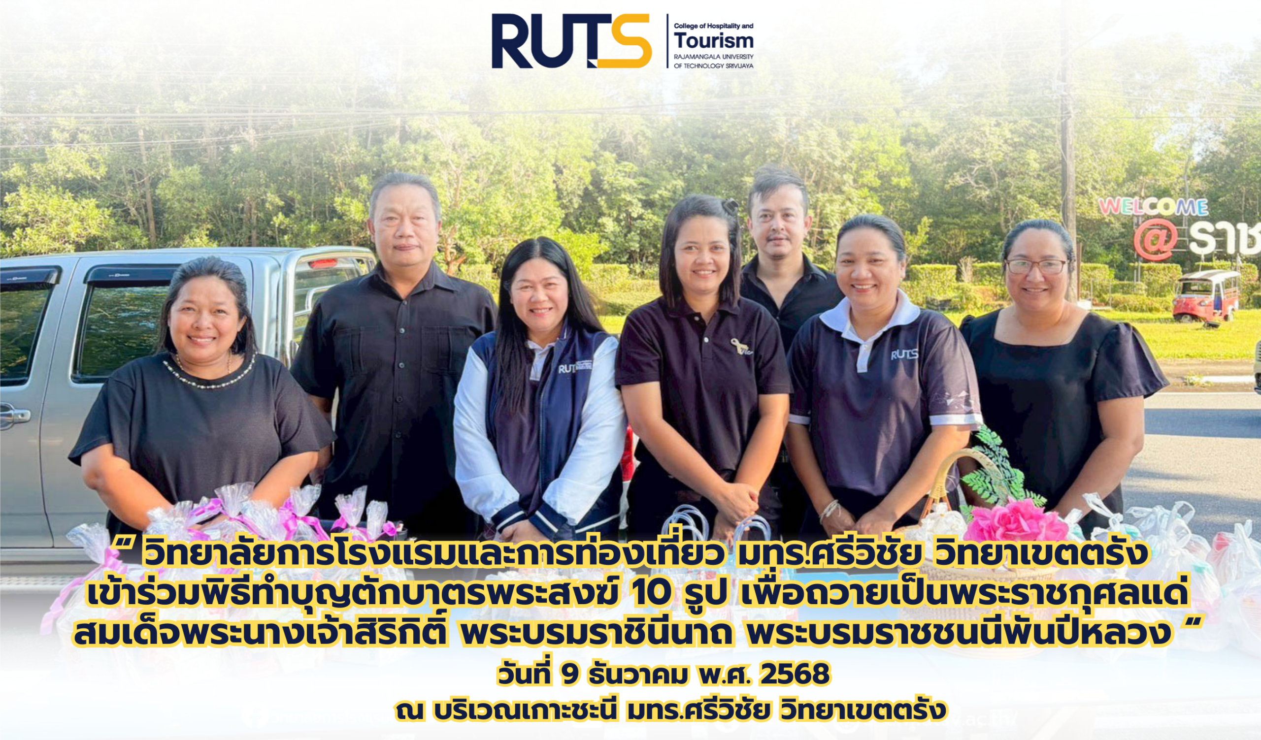 วิทยาลัยการโรงแรมและการท่องเที่ยว มหาวิทยาลัยเทคโนโลยีราชมงคลศรีวิชัย วิทยาเขตตรัง เข้าร่วมพิธีทำบุญตักบาตรพระสงฆ์จำนวน 10 รูป เมื่อวันที่ 9 ธันวาคม 2568 ณ บริเวณเกาะชะนี ภายในวิทยาเขตตรัง เพื่อถวายเป็นพระราชกุศลแด่ สมเด็จพระนางเจ้าสิริกิติ์ พระบรมราชินีนาถ พระบรมราชชนนีพันปีหลวง
