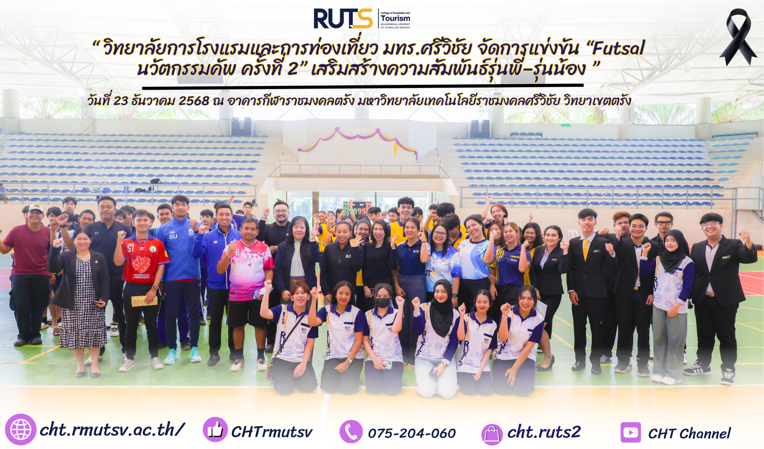 วิทยาลัยการโรงแรมและการท่องเที่ยว มหาวิทยาลัยเทคโนโลยีราชมงคลศรีวิชัย วิทยาเขตตรัง จัดโครงการสานสัมพันธ์นวัตกรรมการค้ารุ่นพี่สู่รุ่นน้อง ภายใต้กิจกรรมการแข่งขัน “Futsal นวัตกรรมคัพ ครั้งที่ 2” เมื่อวันอังคารที่ 23 ธันวาคม 2568 ณ อาคารกีฬาราชมงคลตรัง มหาวิทยาลัยเทคโนโลยีราชมงคลศรีวิชัย วิทยาเขตตรัง โดยมีทีมเข้าร่วมการแข่งขันจำนวนทั้งสิ้น 12 ทีม