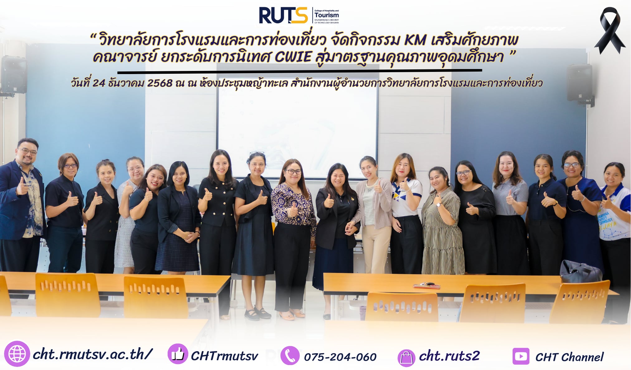 วันที่ 24 ธันวาคม 2568 วิทยาลัยการโรงแรมและการท่องเที่ยว จัดกิจกรรมแลกเปลี่ยนองค์ความรู้ (Knowledge Management : KM) ภายใต้หัวข้อ “แลกเปลี่ยนเรียนรู้เพื่อการนิเทศ CWIE อย่างมีคุณภาพ” ณ ห้องประชุมหญ้าทะเล สำนักงานผู้อำนวยการวิทยาลัยการโรงแรมและการท่องเที่ยว