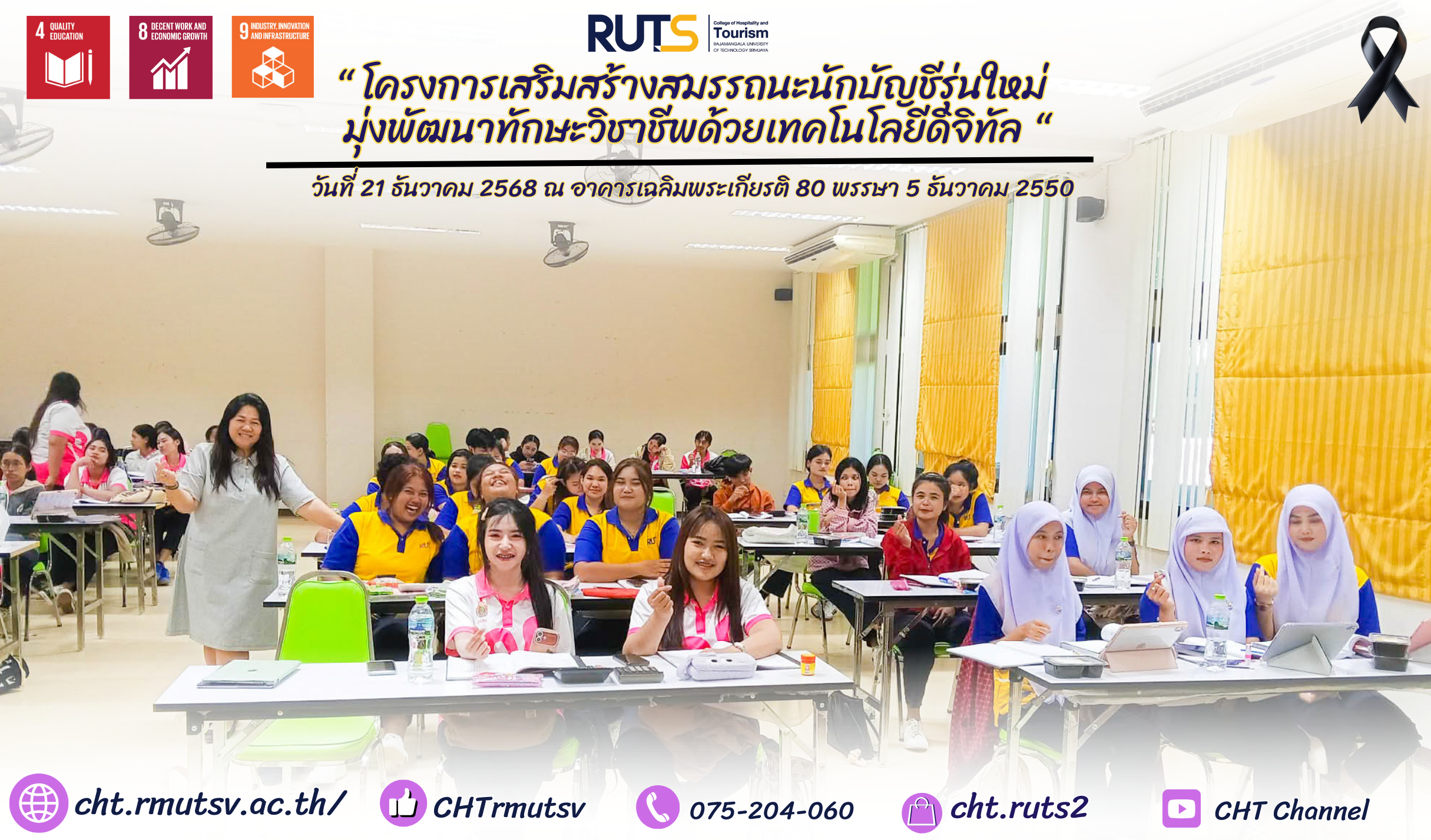 วันที่ 21 ธันวาคม 2568 ณ อาคารเฉลิมพระเกียรติ 80 พรรษา 5 ธันวาคม 2550 ผู้ช่วยศาสตราจารย์ศุกพิชญาณ์ บุญเกื้อ อาจารย์ประจำหลักสูตรบัญชีบัณฑิต ได้จัดโครงการ “เสริมสร้างสมรรถนะนักบัญชีรุ่นใหม่ด้วยเทคโนโลยีดิจิทัล” โดยดำเนินกิจกรรมที่ 1 ภายใต้หัวข้อ “เตรียมความพร้อมสู่การเป็นนักบัญชีมืออาชีพด้านการจัดทำบัญชี” มุ่งเน้นการพัฒนาศักยภาพนักศึกษาให้มีความรู้ ความเข้าใจ และทักษะด้านการบัญชีอย่างรอบด้าน ครอบคลุมกระบวนการทำงานตั้งแต่เริ่มต้นจนถึงการปิดบัญชีอย่างเป็นระบบ
