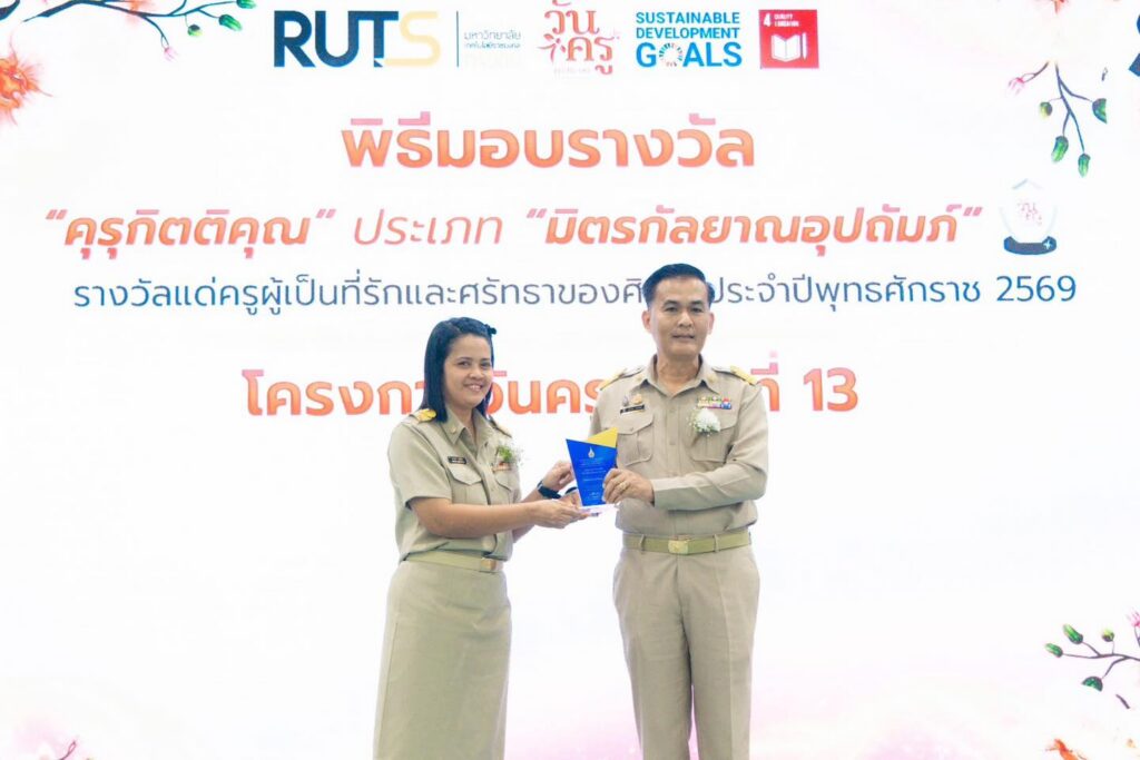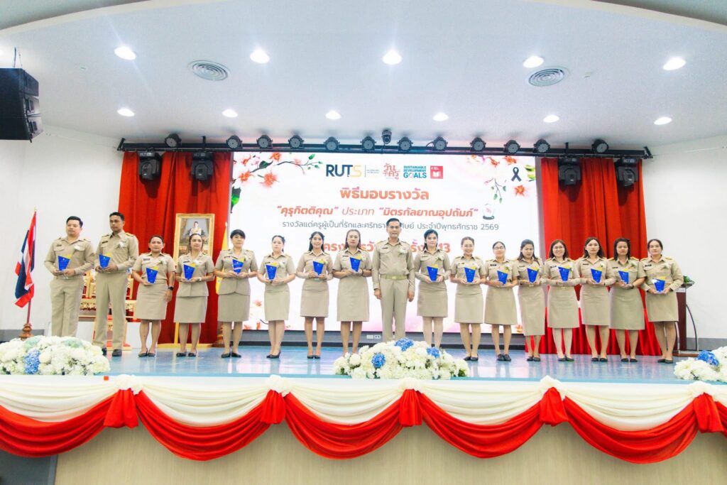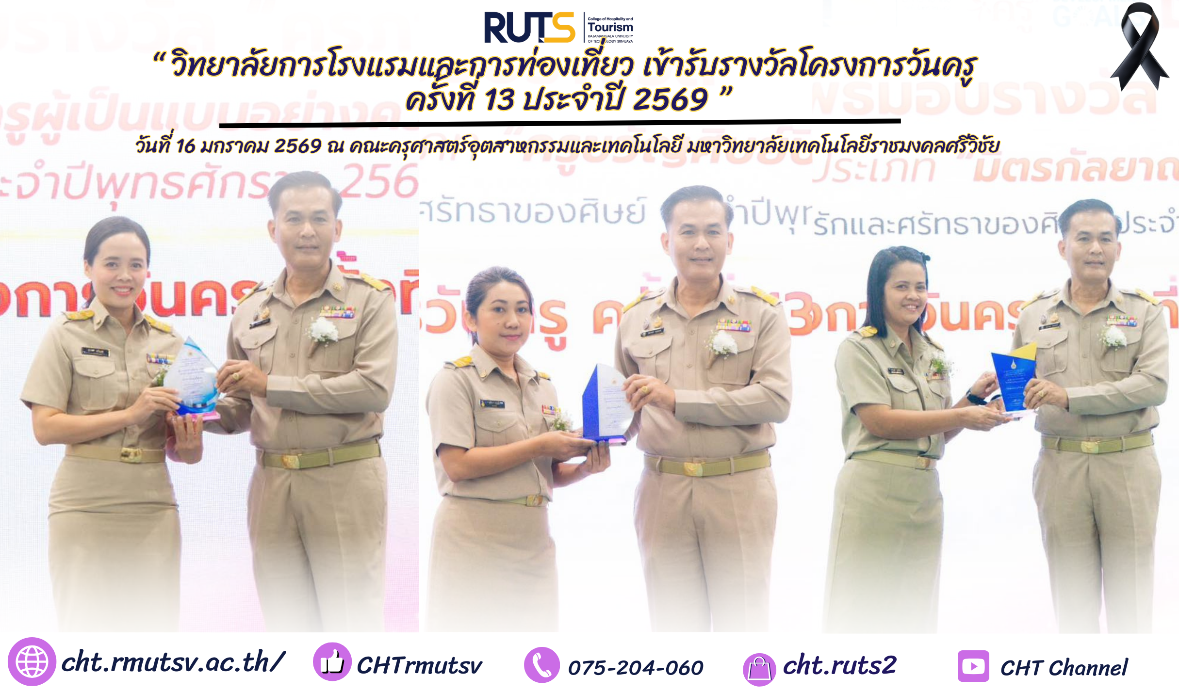 วันที่ 16 มกราคม 2569 คณะครุศาสตร์อุตสาหกรรมและเทคโนโลยี มหาวิทยาลัยเทคโนโลยีราชมงคลศรีวิชัย จัดโครงการวันครู ครั้งที่ 13 ประจำปีพุทธศักราช 2569 ณ ห้องประชุมชูพันธ์ ชั้น 2 อาคารเรียนและปฏิบัติการรวม เพื่อเชิดชูเกียรติและตอกย้ำความสำคัญของวิชาชีพครู ตลอดจนส่งเสริมคุณธรรม จริยธรรม และจรรยาบรรณแห่งวิชาชีพอาจารย์ ในโอกาสนี้ วิทยาลัยการโรงแรมและการท่องเที่ยว มหาวิทยาลัยเทคโนโลยีราชมงคลศรีวิชัย วิทยาเขตตรัง มีคณาจารย์และบุคลากรเข้ารับรางวัลเกียรติยศ ได้แก่ ผู้ช่วยศาสตราจารย์ ดร.จุติมา บุญมี อาจารย์ประจำหลักสูตรศิลปศาสตรบัณฑิต สาขาวิชาการท่องเที่ยวและการบริการ ได้รับรางวัล “คุรุกิตติคุณ” ประเภท “ครูขวัญศิษย์ปิยรักษ์” ,ผู้ช่วยศาสตราจารย์สุภาพร เจริญสุข อาจารย์ประจำหลักสูตรศิลปศาสตรบัณฑิต สาขาวิชาภาษาอังกฤษเพื่อการสื่อสารนานาชาติ ได้รับรางวัล “คุรุภาวนีย์” และนางสาวสุกานดา ฤทธิชัย หัวหน้าหน่วยพัสดุ งานบริหารและวางแผน ได้รับรางวัล “คุรุกิตติคุณ” ประเภท “มิตรกัลยาณอุปถัมถ์”