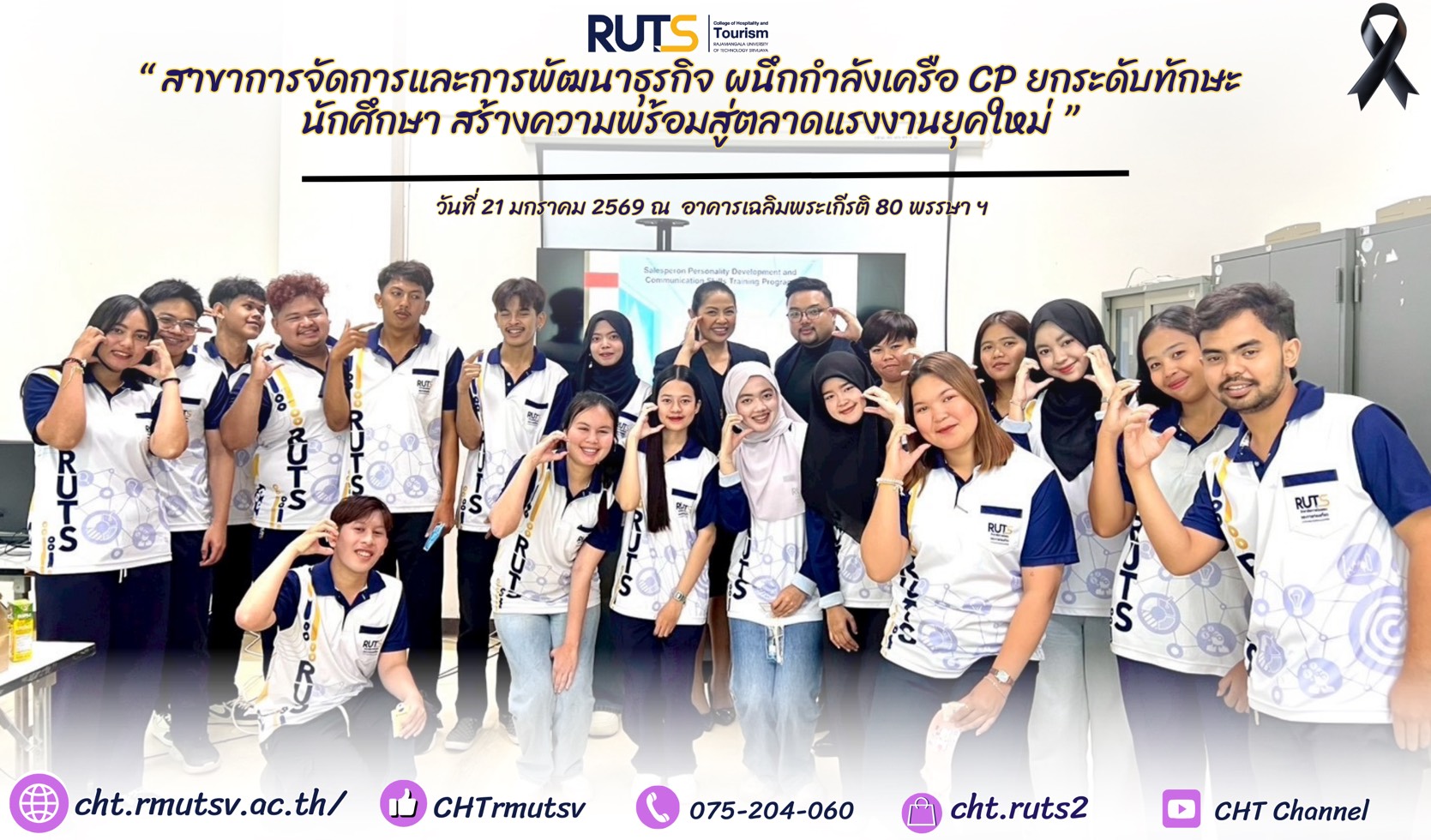 วันที่ 21 มกราคม 2569 ณ อาคารเฉลิมพระเกียรติ 80 พรรษา 5 ธันวาคม 2550 มหาวิทยาลัยเทคโนโลยีราชมงคลศรีวิชัย วิทยาเขตตรัง สาขาวิชาการจัดการและการพัฒนาธุรกิจ วิทยาลัยการโรงแรมและการท่องเที่ยว มหาวิทยาลัยเทคโนโลยีราชมงคลศรีวิชัย วิทยาเขตตรัง จัดโครงการ “ยกระดับความเชี่ยวชาญทางวิชาการของนักศึกษา ภายใต้ความร่วมมือกับบริษัทในเครือ CP และเสริมสร้างเครือข่ายทางการศึกษากับชุมชน” ภายใต้การกำกับดูแลของ อาจารย์หัสชัยปกรณ์ ปานมา อาจารย์ประจำหลักสูตรบริหารธุรกิจบัณฑิต สาขาวิชาการจัดการและการพัฒนาธุรกิจ
