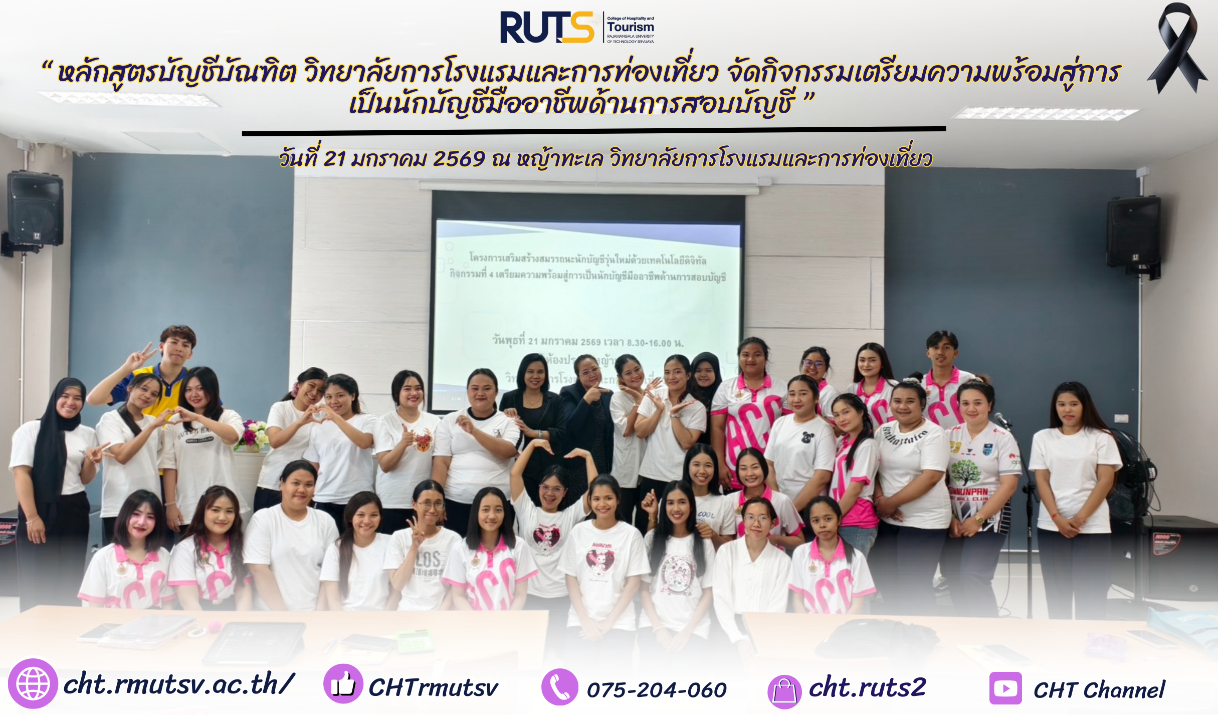 หลักสูตรบัญชีบัณฑิต วิทยาลัยการโรงแรมและการท่องเที่ยว มหาวิทยาลัยเทคโนโลยีราชมงคลศรีวิชัย จัดกิจกรรมที่ 4 “เตรียมความพร้อมสู่การเป็นนักบัญชีมืออาชีพด้านการสอบบัญชี” เมื่อวันที่ 21 มกราคม 2569 ณ ห้องประชุมหญ้าทะเล สำนักงานวิทยาลัยการโรงแรมและการท่องเที่ยว เพื่อพัฒนาความรู้ ความเข้าใจ และเสริมสร้างทักษะที่จำเป็นให้แก่นักศึกษาในการเตรียมความพร้อมสู่เส้นทางวิชาชีพด้านการสอบบัญชี (CPA)