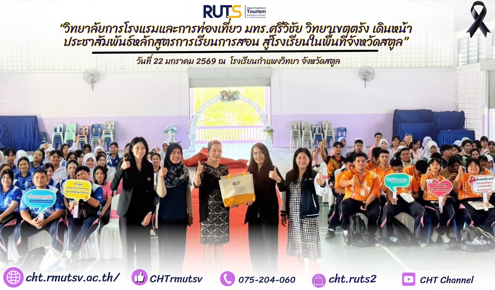 เมื่อวันที่ 22 มกราคม 2569 ผู้ช่วยศาสตราจารย์ศุกพิชญาณ์ บุญเกื้อ รองผู้อำนวยการฝ่ายวิชาการและวิจัย วิทยาลัยการโรงแรมและการท่องเที่ยว มหาวิทยาลัยเทคโนโลยีราชมงคลศรีวิชัย วิทยาเขตตรัง ลงพื้นที่ประชาสัมพันธ์หลักสูตรที่เปิดรับการเรียนการสอน แก่นักเรียนระดับมัธยมศึกษาตอนปลาย ณ โรงเรียนกำแพงวิทยา จังหวัดสตูล