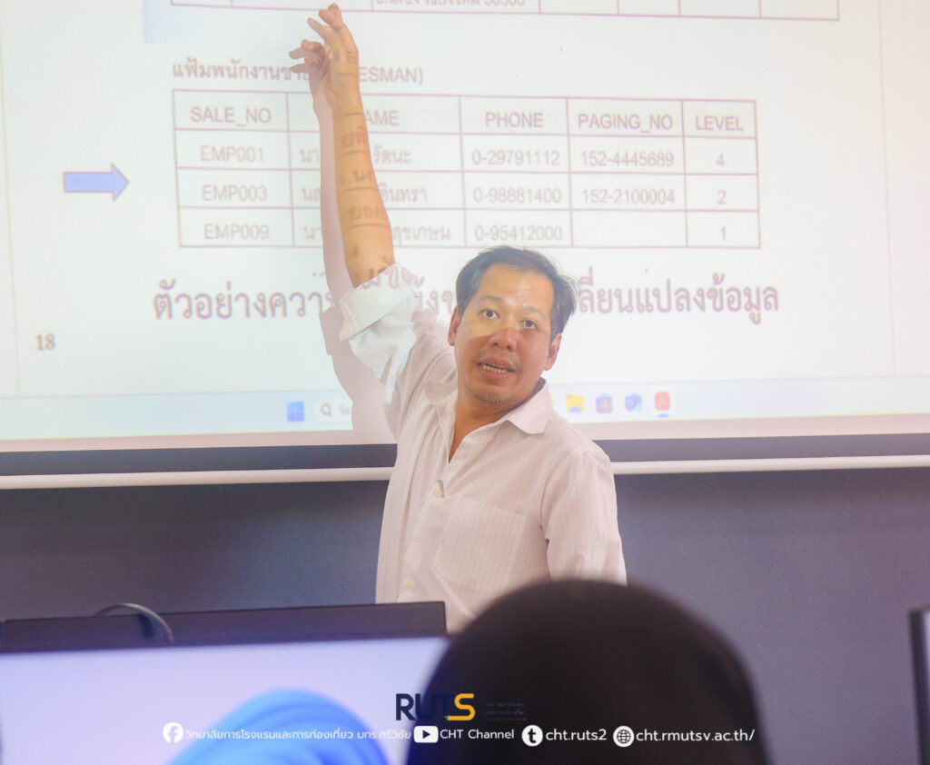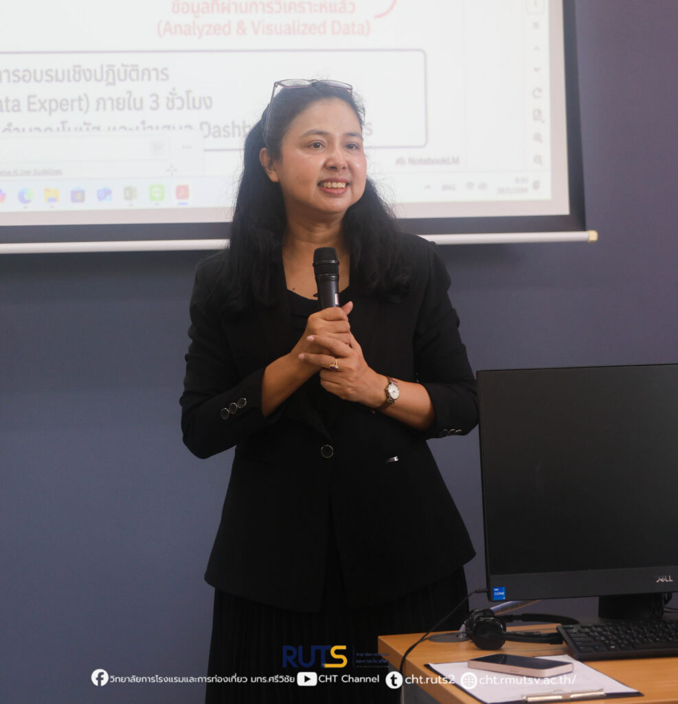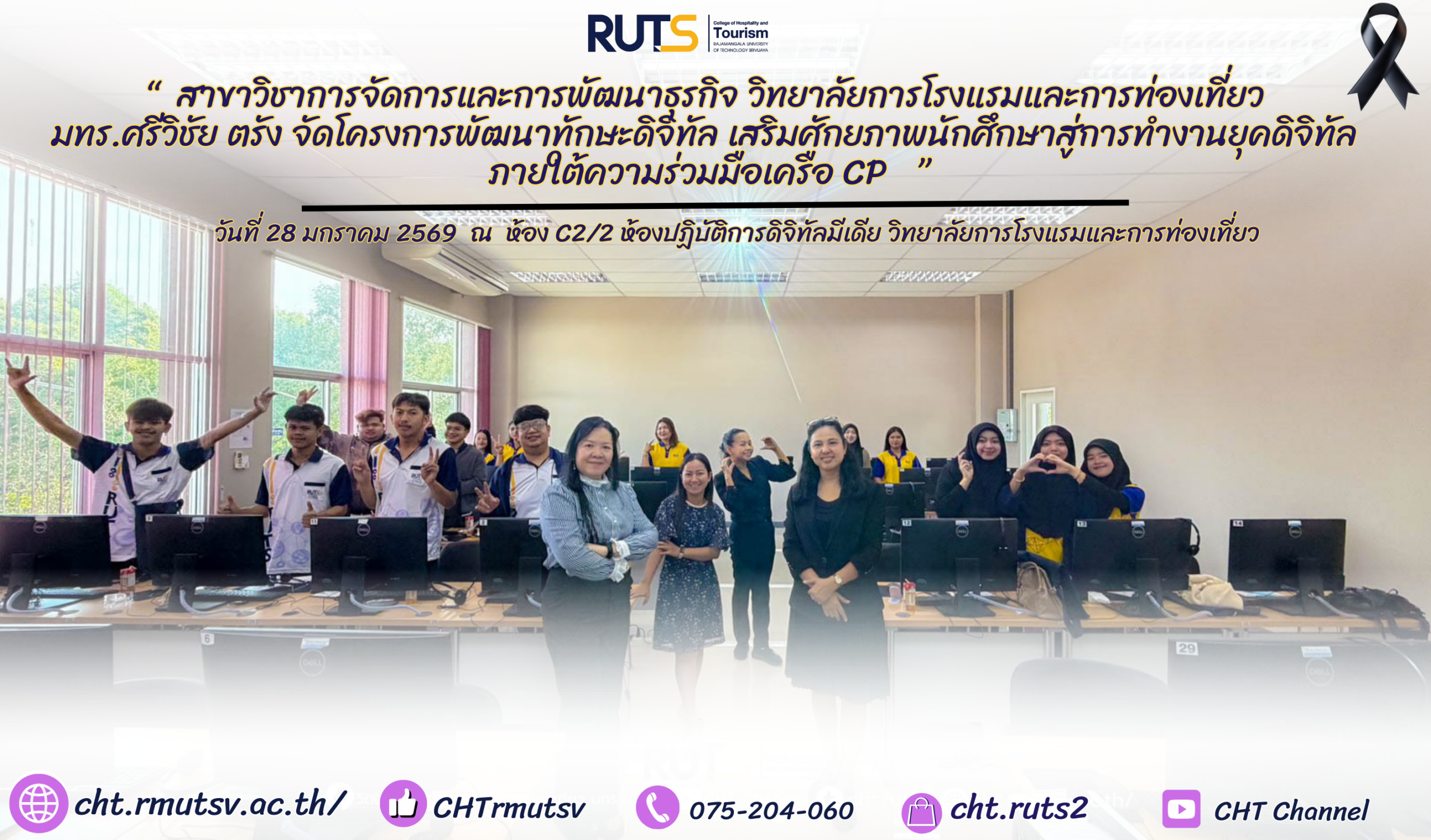วันที่ 28 มกราคม 2569 ณ ห้อง C2/2 ห้องปฏิบัติการดิจิทัลมีเดียในอุตสาหกรรมท่องเที่ยวชายฝั่ง วิทยาลัยการโรงแรมและการท่องเที่ยว มหาวิทยาลัยเทคโนโลยีราชมงคลศรีวิชัย วิทยาเขตตรัง สาขาวิชาการจัดการและการพัฒนาธุรกิจ ได้จัด โครงการยกระดับความเชี่ยวชาญทางวิชาการของนักศึกษาภายใต้ความร่วมมือกับบริษัทในเครือ CP และการเสริมสร้างเครือข่ายทางการศึกษากับชุมชน โดยเป็นกิจกรรมที่ 8 ในหัวข้อ โครงการเสริมสร้างทักษะพื้นฐานด้านดิจิทัลเพื่อการทำงาน มุ่งพัฒนาศักยภาพนักศึกษาให้มีความพร้อมต่อการทำงานในยุคดิจิทัลอย่างมีประสิทธิภาพ