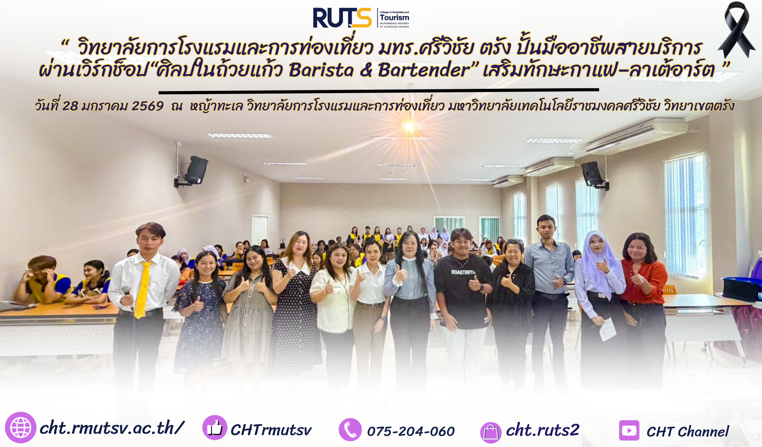 วันที่ 28 มกราคม 2569 ณ หญ้าทะเล วิทยาลัยการโรงแรมและการท่องเที่ยว มหาวิทยาลัยเทคโนโลยีราชมงคลศรีวิชัย วิทยาเขตตรัง จัดโครงการฝึกทักษะและพัฒนาศักยภาพด้านการท่องเที่ยวและการบริการอย่างมืออาชีพ กิจกรรมย่อยที่ 5 “ศิลปในถ้วยแก้ว Barista & Bartender” ภายใต้การอบรมเชิงปฏิบัติการหัวข้อ “การเรียนรู้พื้นฐานการชงกาแฟและศิลปะลาเต้อาร์ต” เพื่อเสริมสร้างองค์ความรู้และทักษะเชิงปฏิบัติให้แก่นักศึกษา ให้สามารถต่อยอดสู่การประกอบอาชีพในอุตสาหกรรมการท่องเที่ยวและการบริการได้อย่างมีคุณภาพ