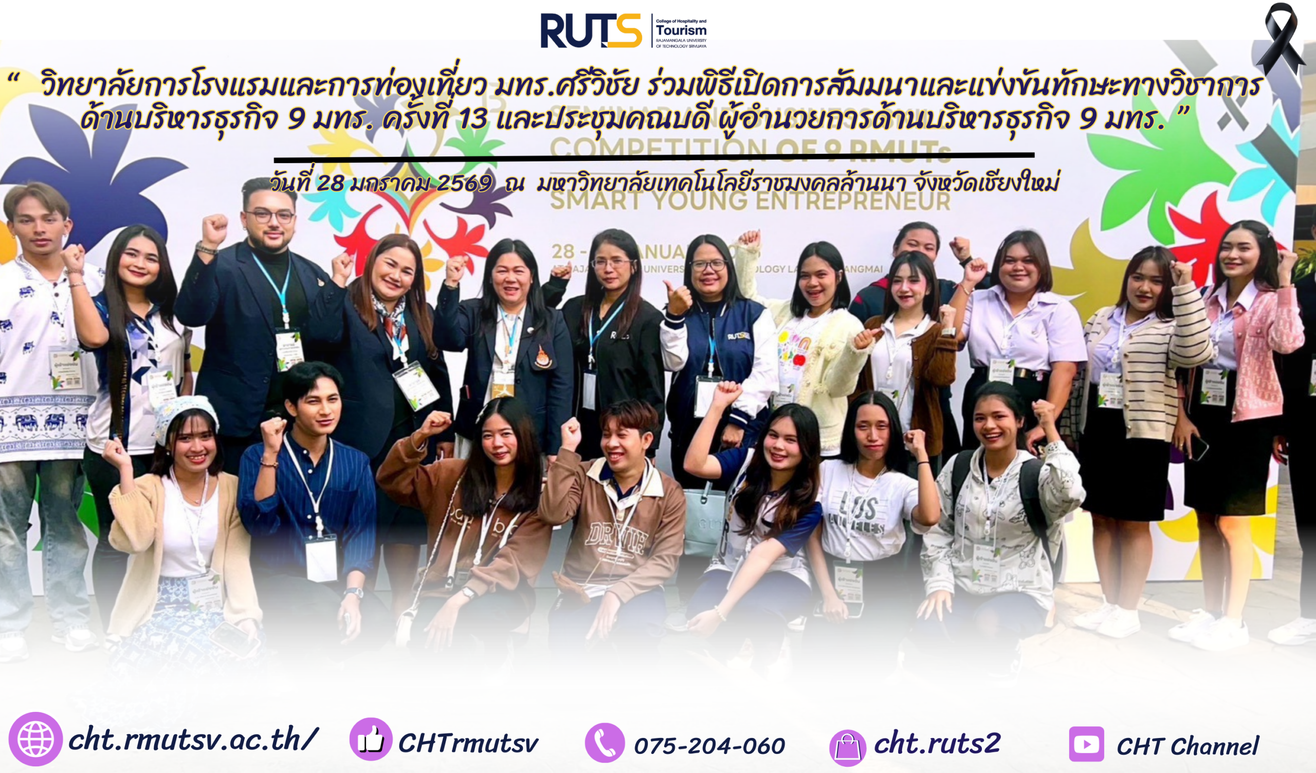 วันที่ 28 มกราคม 2569 คณะผู้บริหาร ตัวแทนคณาจารย์ และตัวแทนนักศึกษา วิทยาลัยการโรงแรมและการท่องเที่ยว มหาวิทยาลัยเทคโนโลยีราชมงคลศรีวิชัย ได้เข้าร่วมพิธีเปิด โครงการการสัมมนาและแข่งขันทักษะทางวิชาการด้านบริหารธุรกิจ 9 มทร. ครั้งที่ 13 ชิงถ้วยพระราชทาน สมเด็จพระกนิษฐาธิราชเจ้า กรมสมเด็จพระเทพรัตนราชสุดาฯ สยามบรมราชกุมารี ณ มหาวิทยาลัยเทคโนโลยีราชมงคลล้านนา จังหวัดเชียงใหม่ ซึ่งเป็นเวทีสำคัญในการแลกเปลี่ยนเรียนรู้และพัฒนาศักยภาพทางวิชาการของนักศึกษาเครือข่ายมหาวิทยาลัยเทคโนโลยีราชมงคลทั่วประเทศ ภายใต้แนวคิด “Empowering Future: Smart Young Entrepreneurs” มุ่งเน้นการเสริมสร้างทักษะด้านบริหารธุรกิจ การคิดเชิงนวัตกรรม การเป็นผู้ประกอบการยุคดิจิทัล และการบูรณาการองค์ความรู้ทางวิชาการสู่การปฏิบัติจริง