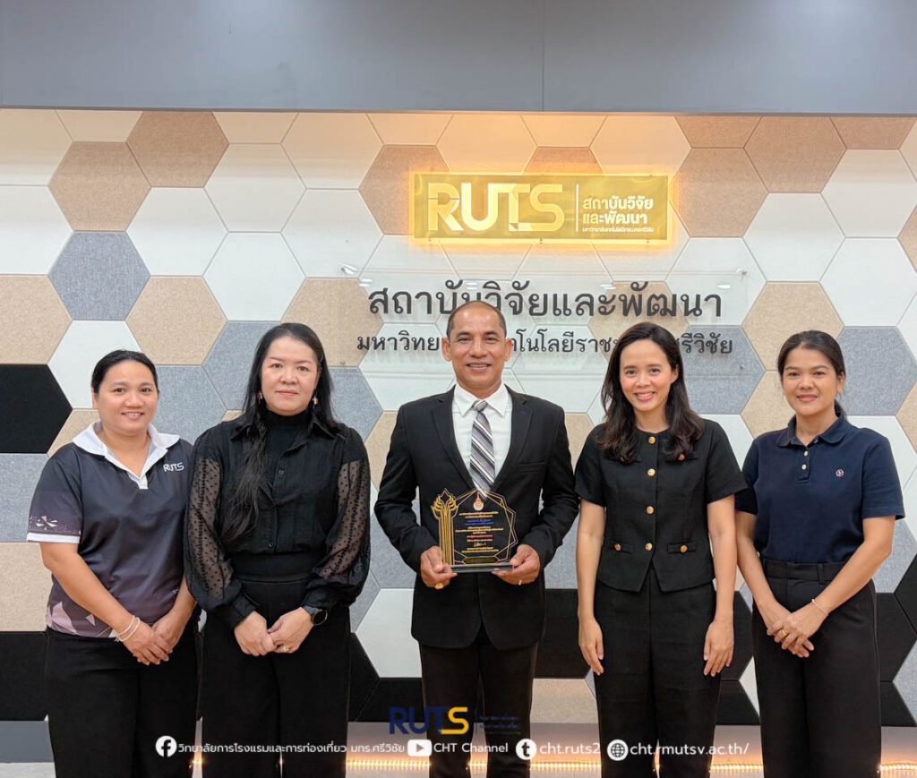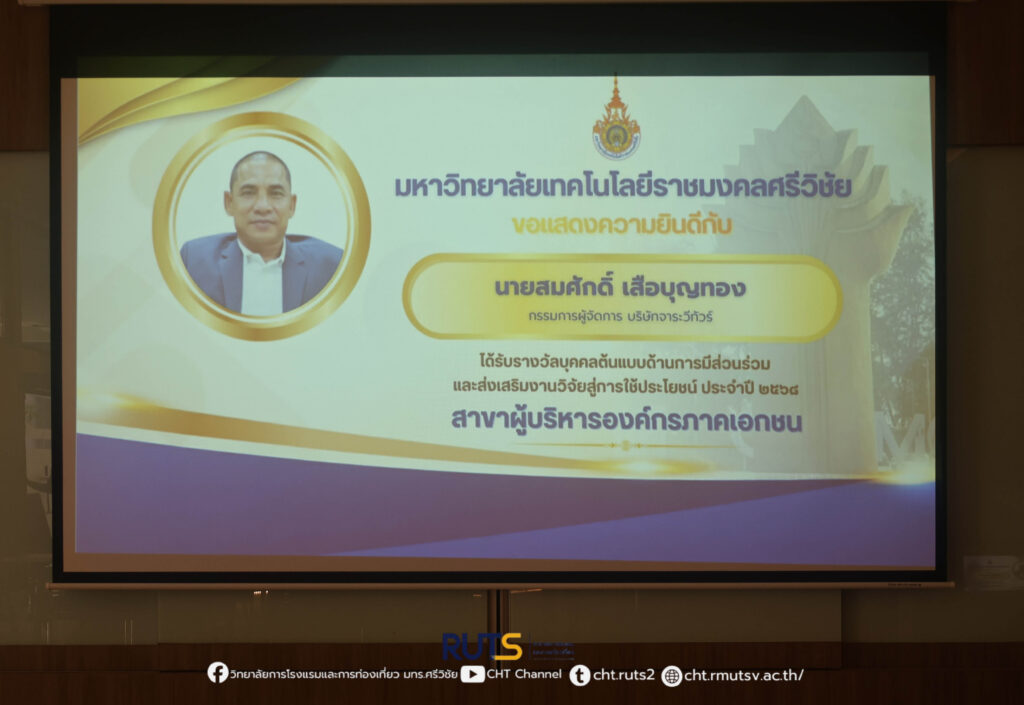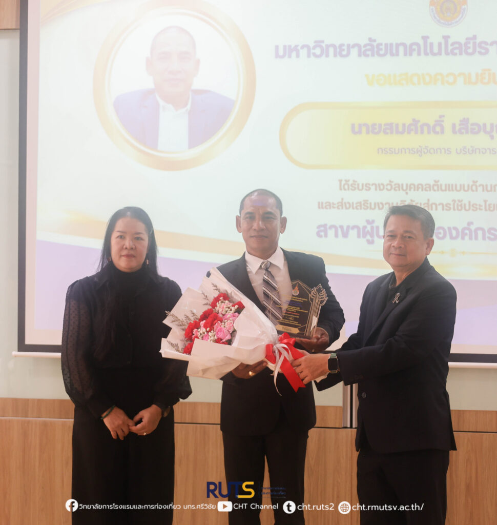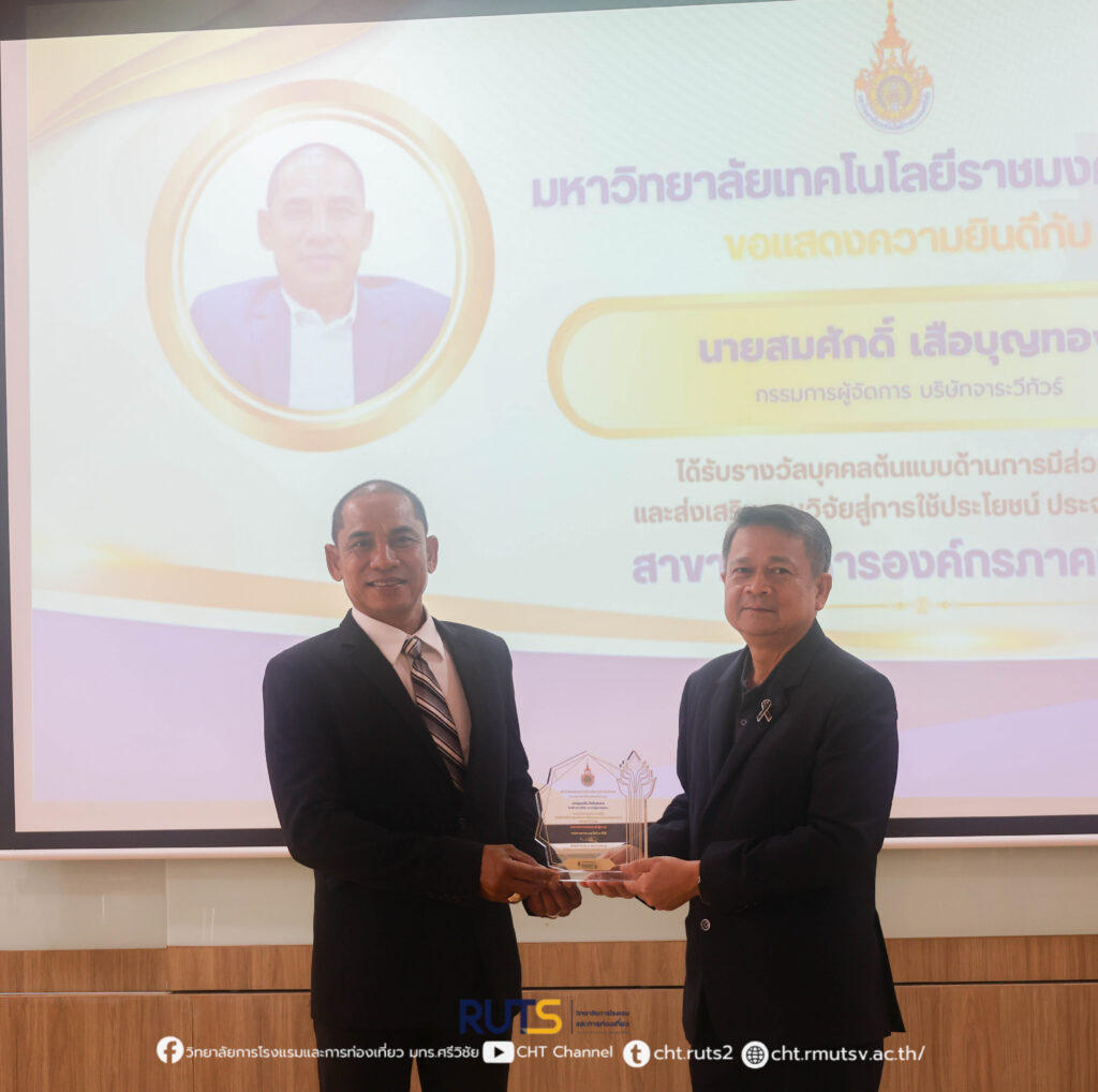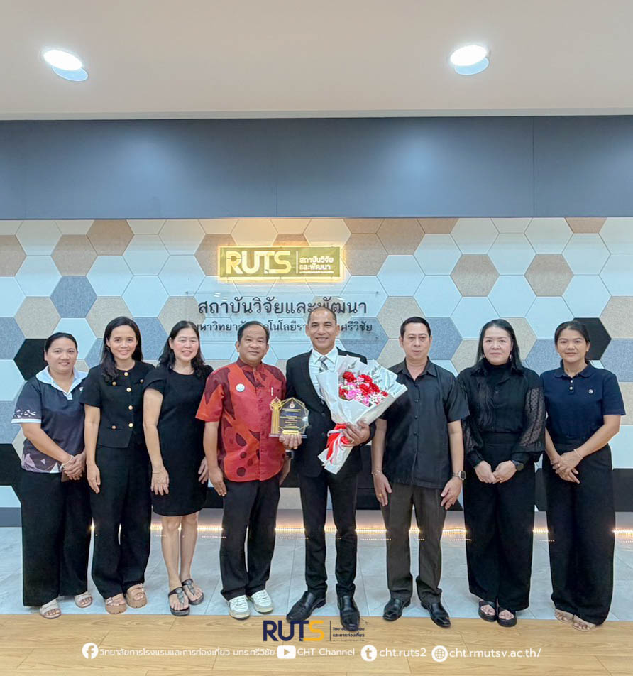 ทั้งนี้ รางวัลดังกล่าวได้มีการมอบอย่างเป็นทางการในวันที่ 21 มกราคม 2569 ภายในงาน RUTS NEXT 2026 ณ คณะครุศาสตร์อุตสาหกรรมและเทคโนโลยี มหาวิทยาลัยเทคโนโลยีราชมงคลศรีวิชัย อำเภอเมือง จังหวัดสงขลา โอกาสนี้ ผู้ช่วยศาสตราจารย์ ฟ้าพิไล ทวีสินโสภา ผู้อำนวยการวิทยาลัยการโรงแรมและการท่องเที่ยว ได้มอบดอกไม้เพื่อแสดงความยินดีและเป็นกำลังใจ พร้อมสะท้อนความร่วมมืออันดีระหว่างสถาบันการศึกษาและภาคเอกชน ในการขับเคลื่อนงานวิจัยสู่การพัฒนาเศรษฐกิจและสังคมอย่างยั่งยืน