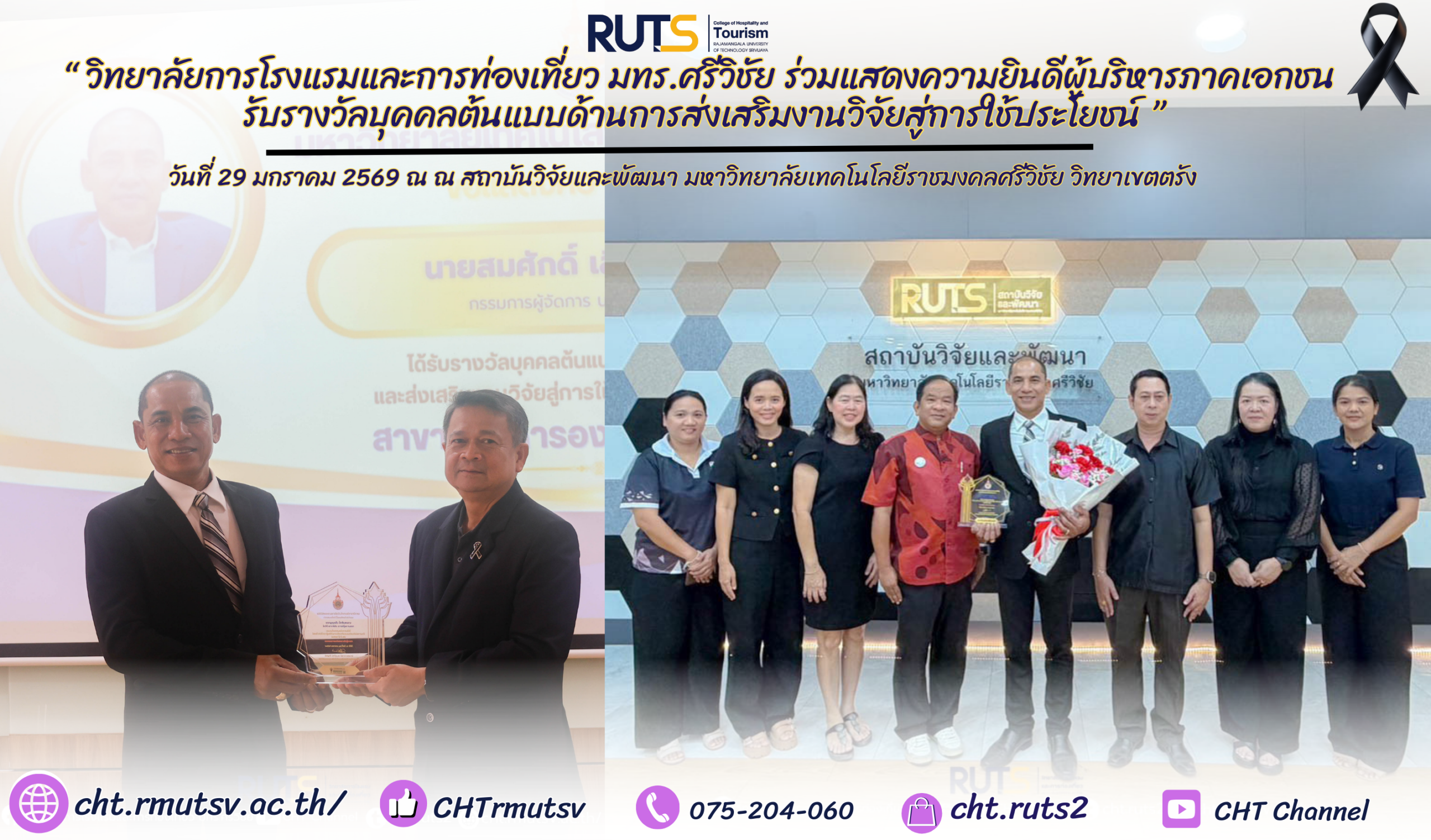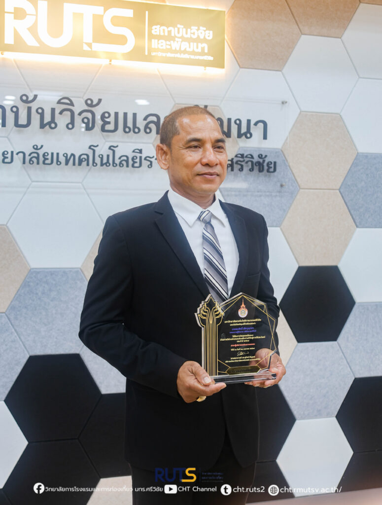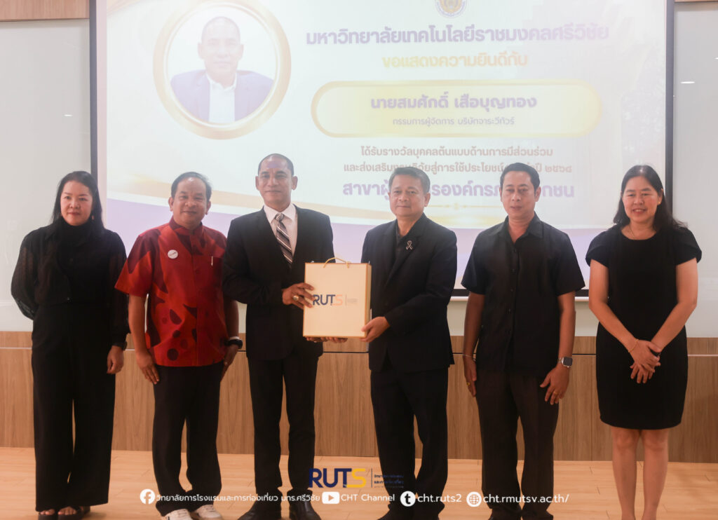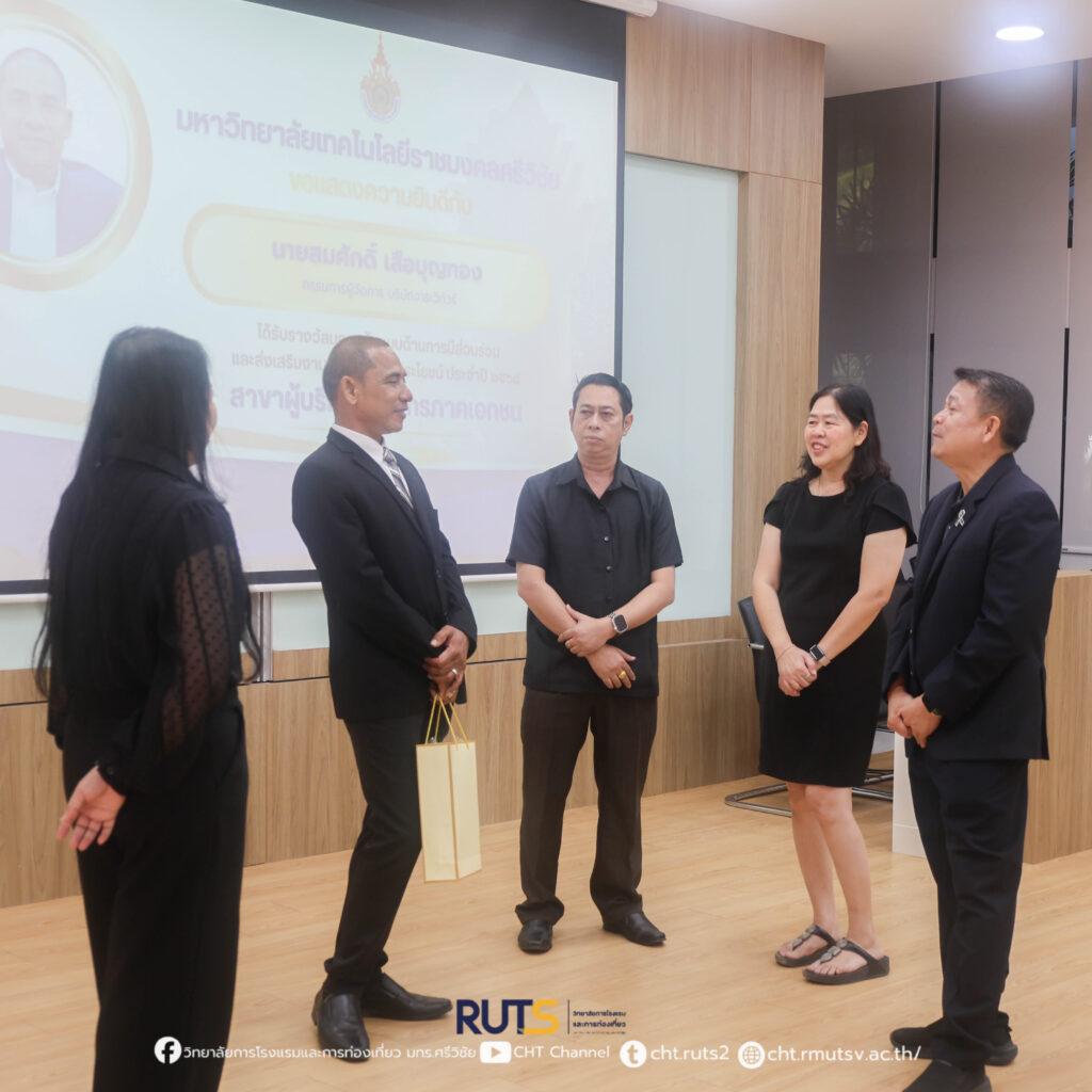ทั้งนี้ รางวัลดังกล่าวได้มีการมอบอย่างเป็นทางการในวันที่ 21 มกราคม 2569 ภายในงาน RUTS NEXT 2026 ณ คณะครุศาสตร์อุตสาหกรรมและเทคโนโลยี มหาวิทยาลัยเทคโนโลยีราชมงคลศรีวิชัย อำเภอเมือง จังหวัดสงขลา โอกาสนี้ ผู้ช่วยศาสตราจารย์ ฟ้าพิไล ทวีสินโสภา ผู้อำนวยการวิทยาลัยการโรงแรมและการท่องเที่ยว ได้มอบดอกไม้เพื่อแสดงความยินดีและเป็นกำลังใจ พร้อมสะท้อนความร่วมมืออันดีระหว่างสถาบันการศึกษาและภาคเอกชน ในการขับเคลื่อนงานวิจัยสู่การพัฒนาเศรษฐกิจและสังคมอย่างยั่งยืน