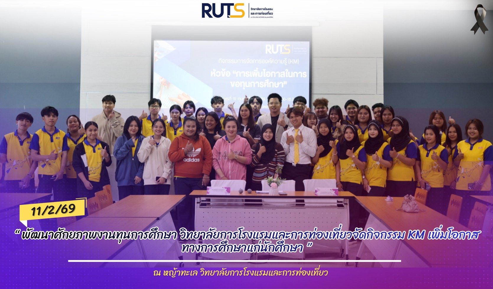 วันที่ 11 กุมภาพันธ์ 2569 ณ ห้องประชุมหญ้าทะเล วิทยาลัยการโรงแรมและการท่องเที่ยว งานพัฒนานักศึกษาและศิษย์เก่าสัมพันธ์ ได้จัดกิจกรรมการจัดการองค์ความรู้ (Knowledge Management : KM) ในหัวข้อ “การเพิ่มโอกาสในการขอทุนการศึกษาจากหน่วยงานภายนอก” เพื่อเป็นเวทีแลกเปลี่ยนองค์ความรู้ แนวปฏิบัติที่ดี และแนวทางการดำเนินงานในการสนับสนุนให้นักศึกษาได้รับทุนการศึกษาอย่างทั่วถึงและมีประสิทธิภาพ