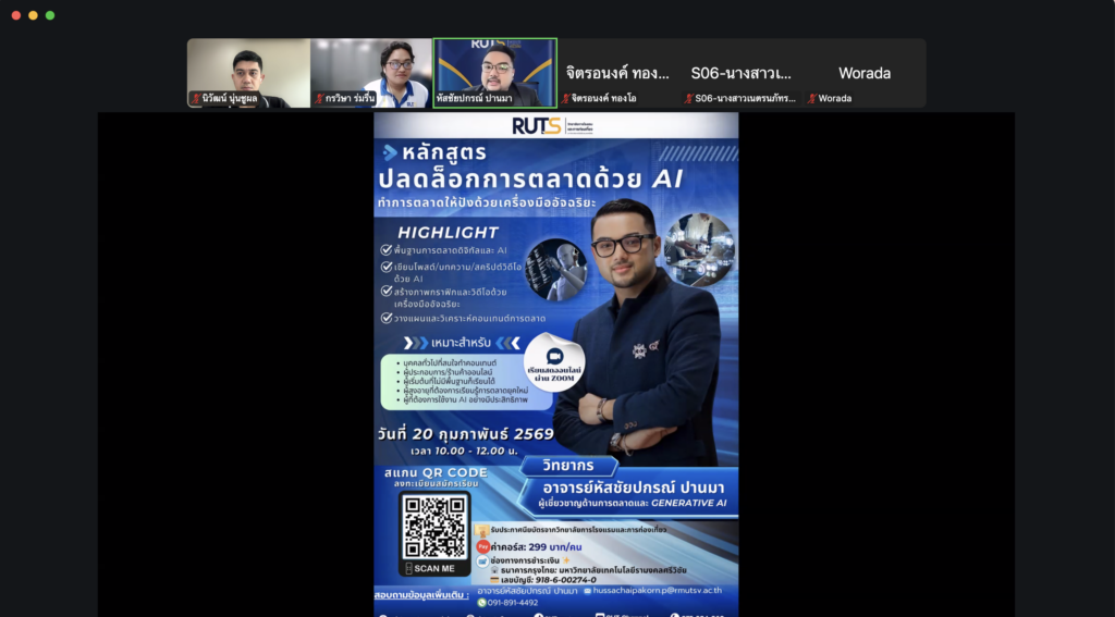 การอบรมได้รับเกียรติจากอาจารย์หัสชัยปกรณ์ ปานมา ผู้เชี่ยวชาญด้านการตลาดและ Generative AI เป็นวิทยากรถ่ายทอดความรู้และประสบการณ์เชิงปฏิบัติ โดยเนื้อหาครอบคลุมตั้งแต่พื้นฐานการตลาดดิจิทัลและการประยุกต์ใช้ AI เทคนิคการเขียนโพสต์ บทความ และสคริปต์วิดีโอด้วยเครื่องมือ AI การสร้างภาพกราฟิกและวิดีโอด้วยเทคโนโลยีอัจฉริยะ ตลอดจนการวางแผนและวิเคราะห์คอนเทนต์การตลาดอย่างเป็นระบบ เพื่อให้ผู้เข้ารับการอบรมสามารถนำองค์ความรู้ไปประยุกต์ใช้ได้จริงในบริบทการทำงานและการประกอบธุรกิจ