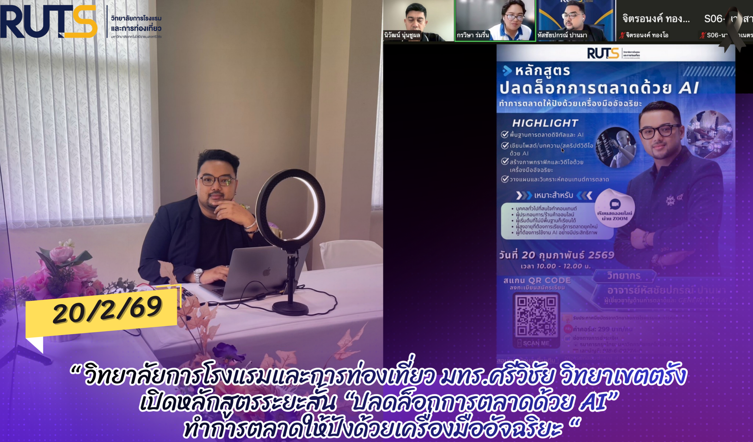 วันที่ 20 กุมภาพันธ์ 2569 วิทยาลัยการโรงแรมและการท่องเที่ยว มหาวิทยาลัยเทคโนโลยีราชมงคลศรีวิชัย วิทยาเขตตรัง จัดอบรมหลักสูตรระยะสั้นหัวข้อ “ปลดล็อกการตลาดด้วย AI ทำการตลาดให้ปังด้วยเครื่องมืออัจฉริยะ” เพื่อยกระดับองค์ความรู้และเสริมสร้างทักษะด้านการตลาดดิจิทัล ควบคู่การประยุกต์ใช้เทคโนโลยีปัญญาประดิษฐ์ (Artificial Intelligence: AI) อย่างมีประสิทธิภาพ ให้แก่ผู้สนใจ นักเรียน นักศึกษา ผู้ประกอบการ และบุคคลทั่วไปที่ประสงค์พัฒนาศักยภาพด้านการตลาดในยุคดิจิทัล