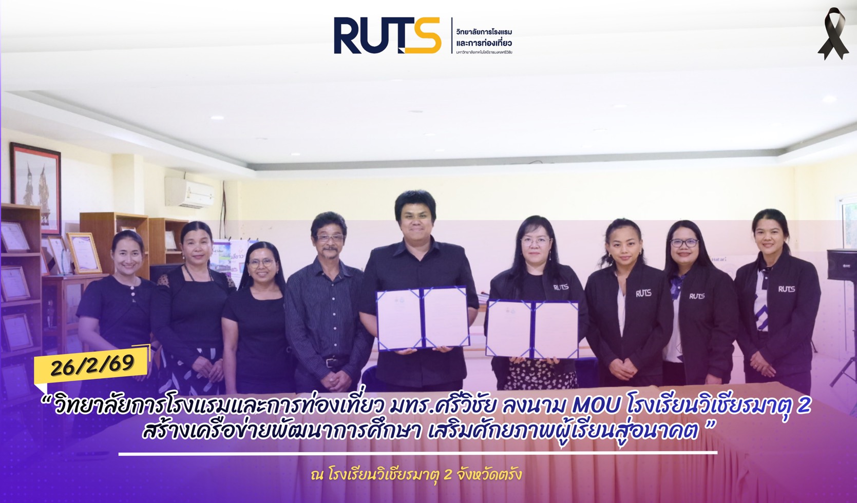 เมื่อวันที่ 26 กุมภาพันธ์ 2569 ณ โรงเรียนวิเชียรมาตุ 2 จังหวัดตรัง วิทยาลัยการโรงแรมและการท่องเที่ยว มหาวิทยาลัยเทคโนโลยีราชมงคลศรีวิชัย ลงนามบันทึกข้อตกลงความเข้าใจ (MOU) ร่วมกับ โรงเรียนวิเชียรมาตุ 2 เพื่อส่งเสริมความร่วมมือทางวิชาการและพัฒนาศักยภาพผู้เรียน