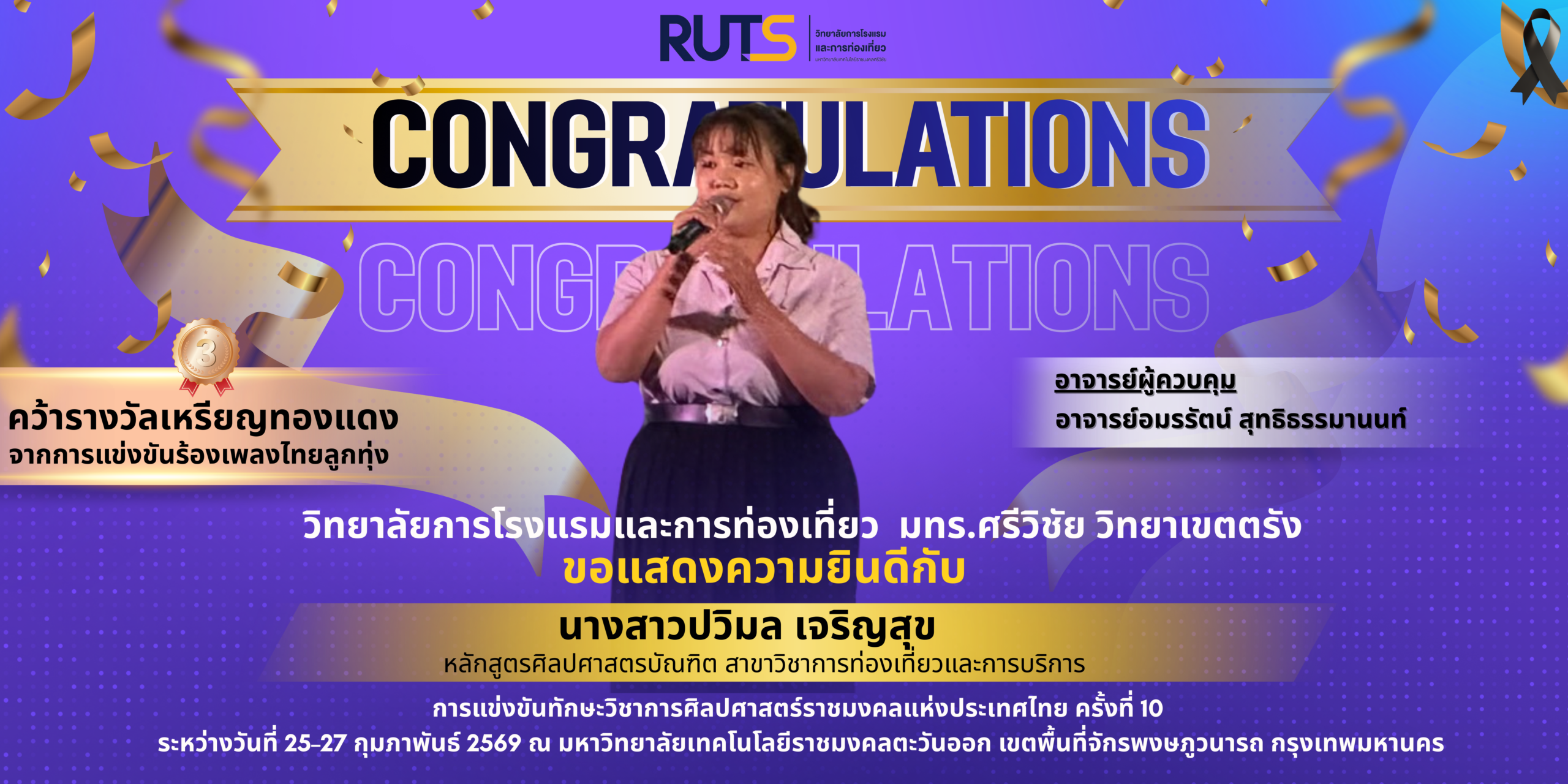 จากการแข่งขันร้องเพลงไทยลูกทุ่ง อาจารย์ผู้ควบคุม: อาจารย์อมรรัตน์ สุทธิธรรมานนท์ 📍 การแข่งขันทักษะวิชาการศิลปศาสตร์ราชมงคลแห่งประเทศไทย ครั้งที่ 10