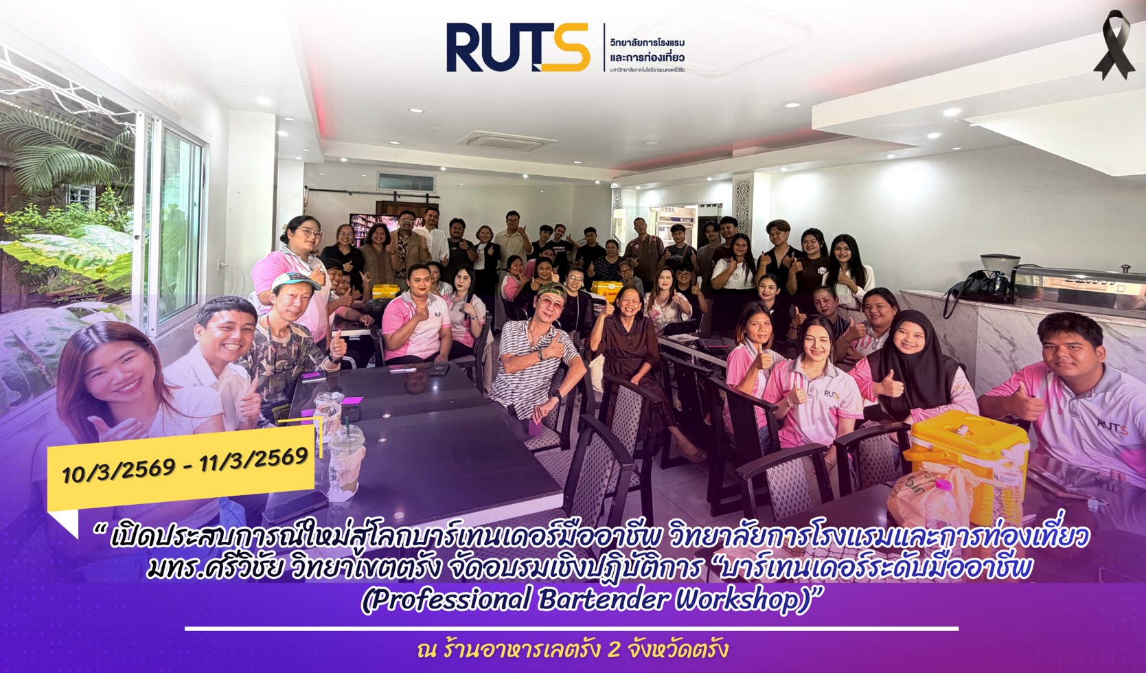 วิทยาลัยการโรงแรมและการท่องเที่ยว มหาวิทยาลัยเทคโนโลยีราชมงคลศรีวิชัย วิทยาเขตตรัง จัดโครงการ “จากวิกฤติสู่การปรับตัว : การพัฒนาการท่องเที่ยวทางทะเลอ่าวไทย–อันดามันคุณภาพสูง ด้วยการพัฒนาระบบนิเวศการเรียนรู้ การจัดการสมัยใหม่ เทคโนโลยีและนวัตกรรม” กิจกรรมที่ 6 การพัฒนาทุนมนุษย์ด้านการท่องเที่ยว กิจกรรมย่อยที่ 1 การบริหารจัดการศูนย์พัฒนาการฝึกอบรม (หลักสูตรระยะสั้น) และกิจกรรมที่ 9 อบรมเชิงปฏิบัติการหลักสูตรบาร์เทนเดอร์ระดับมืออาชีพ ระหว่างวันที่ 10 – 11 มีนาคม 2569 ณ ร้านอาหารเลตรัง 2 จังหวัดตรัง เพื่อพัฒนาทักษะการผสมเครื่องดื่มและยกระดับศักยภาพด้านการบริการให้แก่ผู้เข้าร่วมอบรม