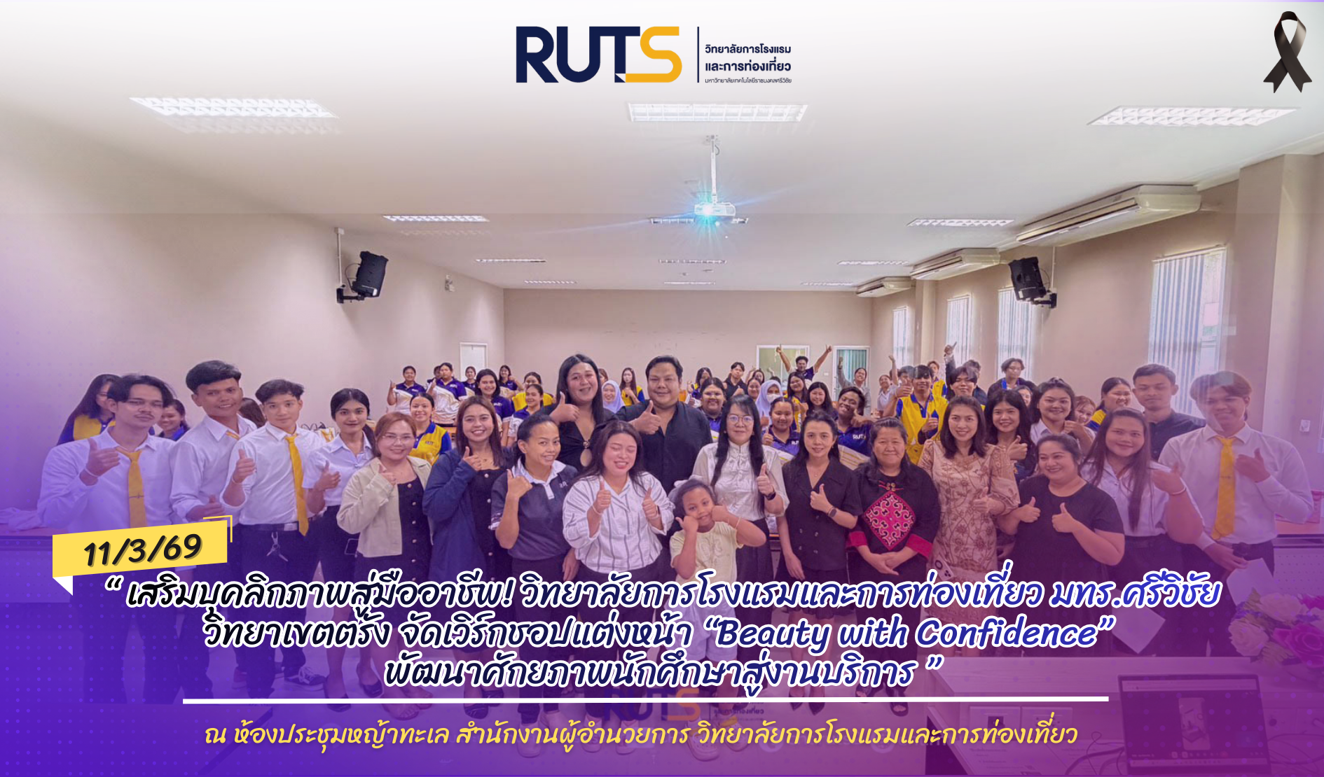 วันที่ 11 มีนาคม 2569 สาขาวิชาการท่องเที่ยวและการบริการ วิทยาลัยการโรงแรมและการท่องเที่ยว มหาวิทยาลัยเทคโนโลยีราชมงคลศรีวิชัย วิทยาเขตตรัง จัดกิจกรรมอบรมเชิงปฏิบัติการ “Beauty with Confidence : Makeup Workshop to Enhance Personality” ณ ห้องประชุมหญ้าทะเล เพื่อเสริมสร้างทักษะด้านบุคลิกภาพและการแต่งหน้าที่เหมาะสมกับการทำงานในสายงานด้านการท่องเที่ยวและการบริการ