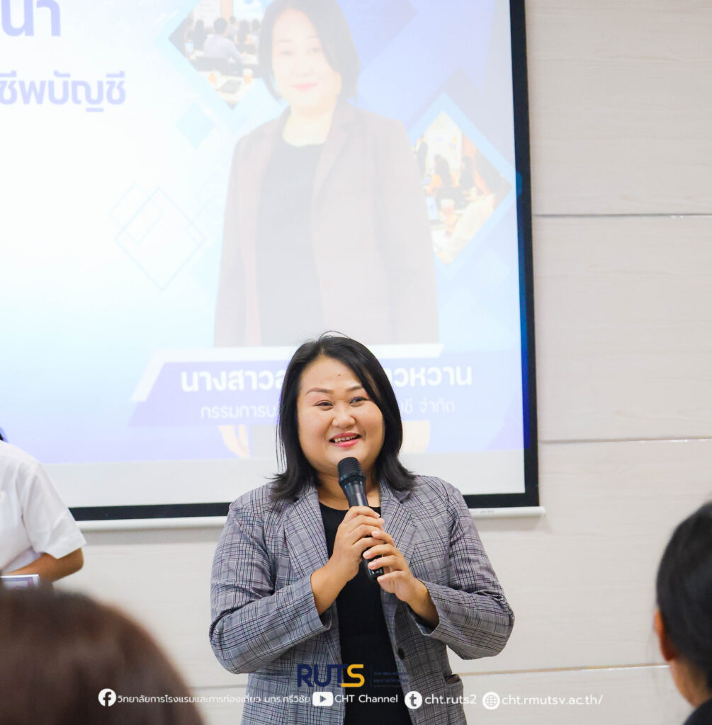 ในการนี้ ได้รับเกียรติจาก คุณสาวิตรี ขาวหวาน กรรมการบริษัท ธันยสาการบัญชี จำกัด มาเป็นวิทยากรบรรยายพิเศษ ถ่ายทอดประสบการณ์การทำงานจริง พร้อมให้คำแนะนำเกี่ยวกับแนวทางการพัฒนาตนเองสู่การเป็นนักบัญชีมืออาชีพ รวมถึงการเตรียมความพร้อมในการประกอบอาชีพในอนาคต