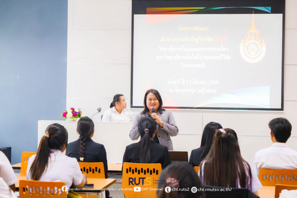 วันที่ 13 มีนาคม 2569 หลักสูตรบัญชีบัณฑิต วิทยาลัยการโรงแรมและการท่องเที่ยว มหาวิทยาลัยเทคโนโลยีราชมงคลศรีวิชัย วิทยาเขตตรัง จัดโครงการสัมมนาในหัวข้อ “เส้นทางความสำเร็จสู่วิชาชีพบัญชี” ณ ห้องประชุมหญ้าทะเล วิทยาลัยการโรงแรมและการท่องเที่ยว โดยกิจกรรมดังกล่าวเป็นส่วนหนึ่งของรายวิชา สัมมนาทางการบัญชี ที่มุ่งเน้นให้นักศึกษาได้เรียนรู้และแลกเปลี่ยนประสบการณ์เกี่ยวกับวิชาชีพบัญชีในมิติของการทำงานจริง