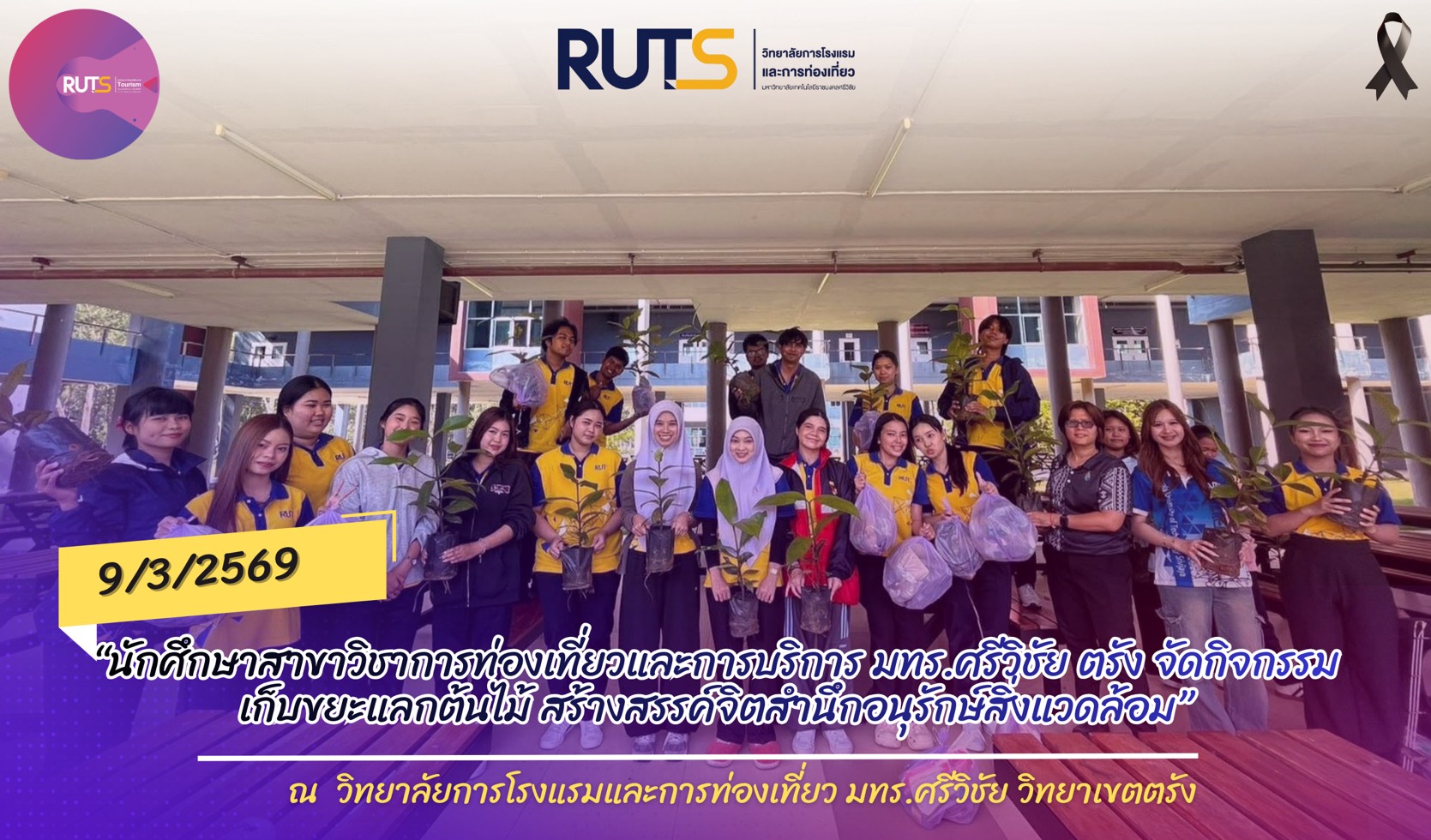 เมื่อวันที่ 9 มีนาคม 2569 ณ วิทยาลัยการโรงแรมและการท่องเที่ยว มหาวิทยาลัยเทคโนโลยีราชมงคลศรีวิชัย วิทยาเขตตรัง นักศึกษาชั้นปีที่ 2 หลักสูตรศิลปศาสตรบัณฑิต สาขาวิชาการท่องเที่ยวและการบริการ ได้จัดกิจกรรม “เก็บขยะอย่างสร้างสรรค์ ใส่ใจสิ่งแวดล้อม” ภายใต้รายวิชา กิจกรรมสัมพันธ์สำหรับงานบริการ โดยมีเป้าหมายเพื่อปลูกฝังจิตสำนึกด้านการอนุรักษ์สิ่งแวดล้อม ควบคู่กับการเสริมสร้างความสามัคคีและการทำงานเป็นทีมให้แก่นักศึกษา
