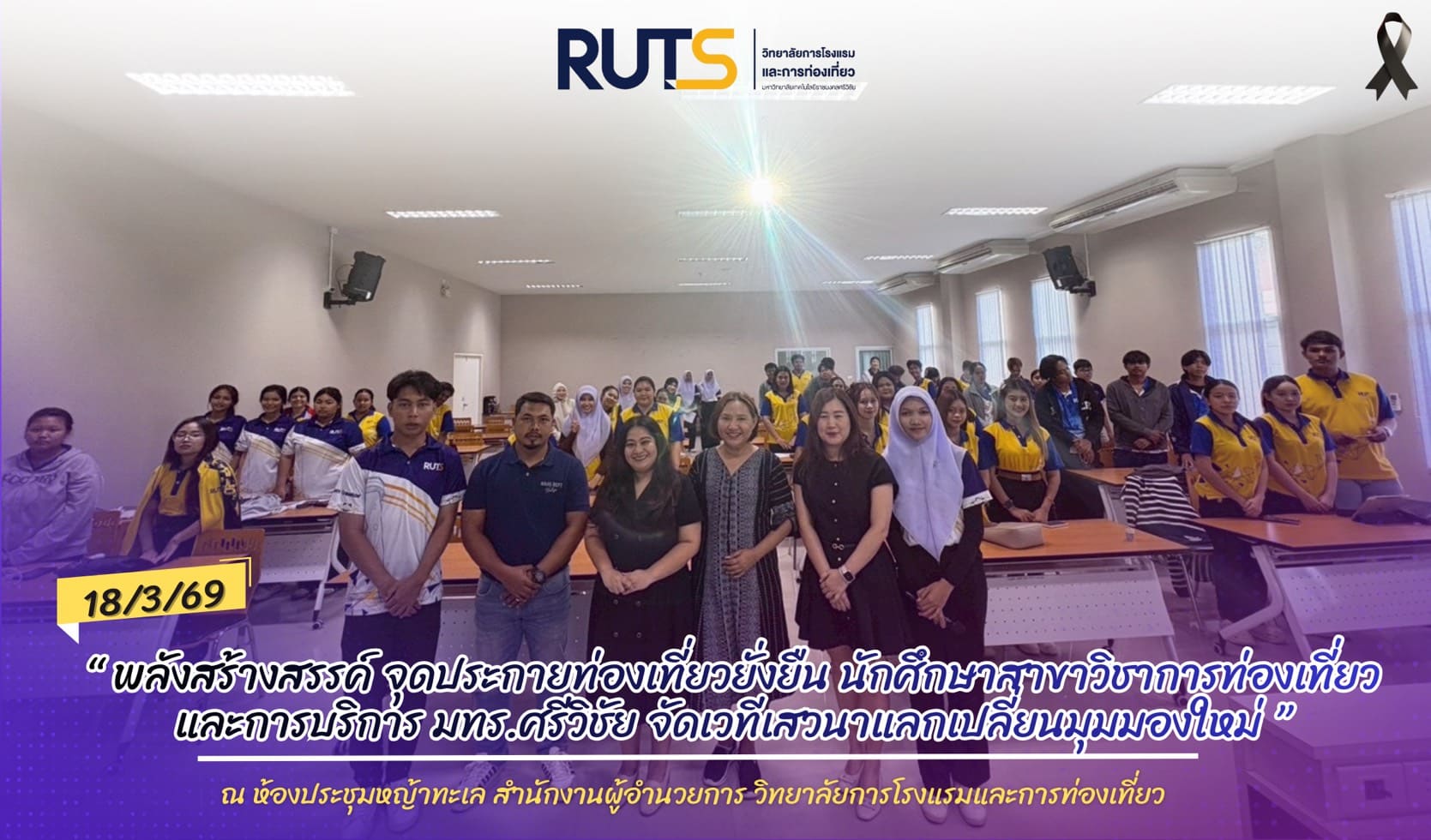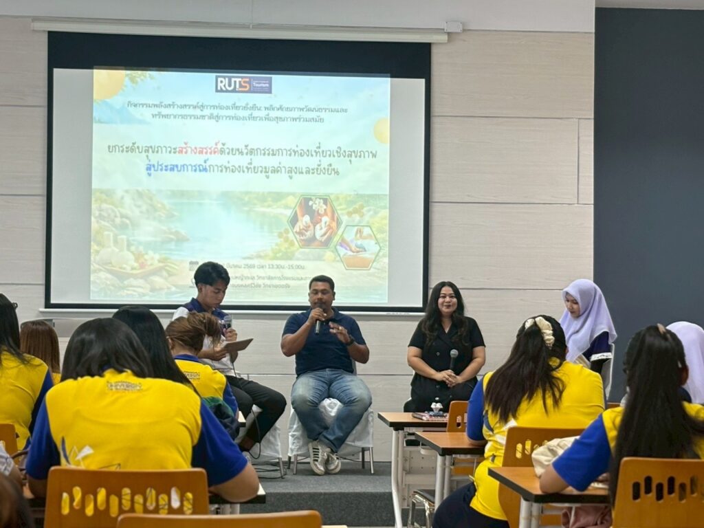เมื่อวันที่ 18 มีนาคม 2569 ณ ห้องประชุมหญ้าทะเล วิทยาลัยการโรงแรมและการท่องเที่ยวจัดกิจกรรมเสวนา “พลังสร้างสรรค์สู่การท่องเที่ยวยั่งยืน: พลิกศักยภาพวัฒนธรรมและทรัพยากรธรรมชาติสู่การท่องเที่ยวร่วมสมัย” จัดขึ้นโดยนักศึกษาในรายวิชาสัมมนาเพื่ออุตสาหกรรมท่องเที่ยวและบริการ ชั้นปีที่ 1 (เทียบโอน) ภายใต้การดูแลของอาจารย์วันวิสาข์ พลอย อินสว่าง อาจารย์ผู้สอนรายวิชา โดยมีวัตถุเพื่อเปิดพื้นที่แห่งการเรียนรู้ แลกเปลี่ยนองค์ความรู้ และสร้างมุมมองใหม่ด้านการท่องเที่ยวอย่างยั่งยืน