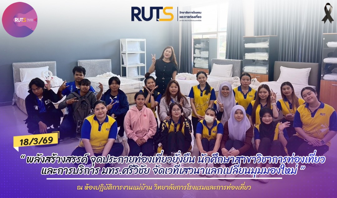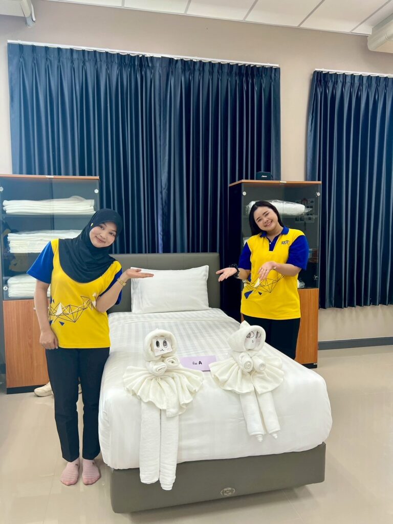 วิทยาลัยการโรงแรมและการท่องเที่ยว จัดกิจกรรมเชิงปฏิบัติการ “ศิลปะแห่งการปูเตียงและตกแต่งห้องพัก: การออกแบบประสบการณ์ด้วยวัฒนธรรมสร้างสรรค์และ Eco-Design” เพื่อเสริมสร้างทักษะวิชาชีพด้านงานแม่บ้านให้แก่นักศึกษา โดยบูรณาการการเรียนการสอนในรายวิชาการบริการและจัดการงานแม่บ้าน มุ่งเน้นการพัฒนาทักษะเชิงสร้างสรรค์ควบคู่กับแนวคิดการออกแบบที่เป็นมิตรต่อสิ่งแวดล้อม