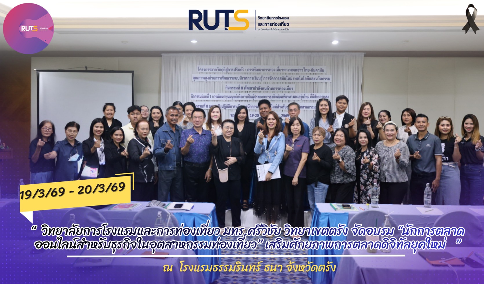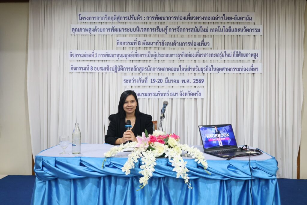 ระหว่างวันที่ 19 – 20 มีนาคม 2569 ณ โรงแรมธรรมรินทร์ ธนา จังหวัดตรัง วิทยาลัยการโรงแรมและการท่องเที่ยว มหาวิทยาลัยเทคโนโลยีราชมงคลศรีวิชัย วิทยาเขตตรัง จัดโครงการอบรมเชิงปฏิบัติการ “หลักสูตรนักการตลาดออนไลน์สำหรับธุรกิจในอุตสาหกรรมท่องเที่ยว” เพื่อเสริมสร้างองค์ความรู้และพัฒนาทักษะด้านการตลาดออนไลน์ให้แก่ผู้ประกอบการ นักศึกษา และผู้สนใจในอุตสาหกรรมการท่องเที่ยว ให้สามารถนำเครื่องมือและกลยุทธ์การตลาดดิจิทัลไปประยุกต์ใช้ในการพัฒนาธุรกิจได้อย่างมีประสิทธิภาพในยุคเศรษฐกิจดิจิทัล