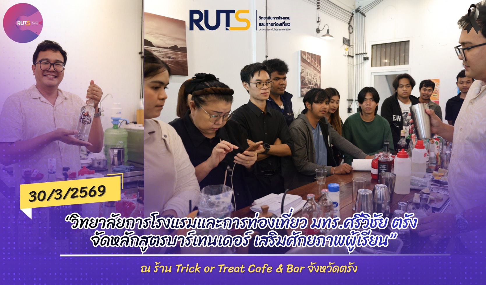 วันที่ 30 มีนาคม 2569 ณ ร้าน Trick or Treat Cafe & Bar จังหวัดตรัง วิทยาลัยการโรงแรมและการท่องเที่ยว มหาวิทยาลัยเทคโนโลยีราชมงคลศรีวิชัย วิทยาเขตตรัง จัดโครงการอบรมหลักสูตรระยะสั้น “หลักสูตรการผสมเครื่องดื่มบาร์เทนเดอร์” เพื่อพัฒนาทักษะด้านการบริการและการผสมเครื่องดื่มให้แก่ผู้เข้าร่วมอบรม ให้มีความรู้ ความสามารถ และทักษะเชิงปฏิบัติที่สอดคล้องกับความต้องการของอุตสาหกรรมในยุคปัจจุบัน