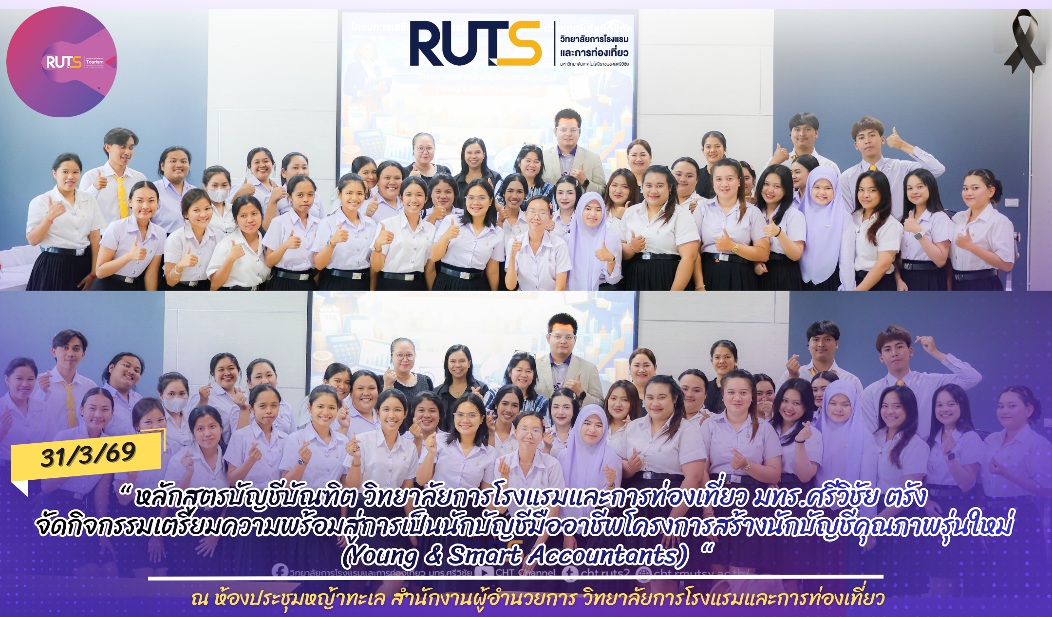 วันที่ 31 มีนาคม 2569 ณ ห้องประชุมหญ้าทะเล สำนักงานวิทยาลัยการโรงแรมและการท่องเที่ยว มหาวิทยาลัยเทคโนโลยีราชมงคลศรีวิชัย วิทยาเขตตรัง หลักสูตรบัญชีบัณฑิต วิทยาลัยการโรงแรมและการท่องเที่ยว จัดกิจกรรมที่ 6 เตรียมความพร้อมสู่การเป็นนักบัญชีมืออาชีพโครงการสร้างนักบัญชีคุณภาพรุ่นใหม่ (Young & Smart Accountants)” ภายใต้ โครงการเสริมสร้างสมรรถนะนักบัญชีรุ่นใหม่ด้วยเทคโนโลยีดิจิทัลเพื่อเสริมสร้างทักษะและพัฒนาศักยภาพนักศึกษาให้พร้อมก้าวสู่สายวิชาชีพบัญชีอย่างมีคุณภาพ