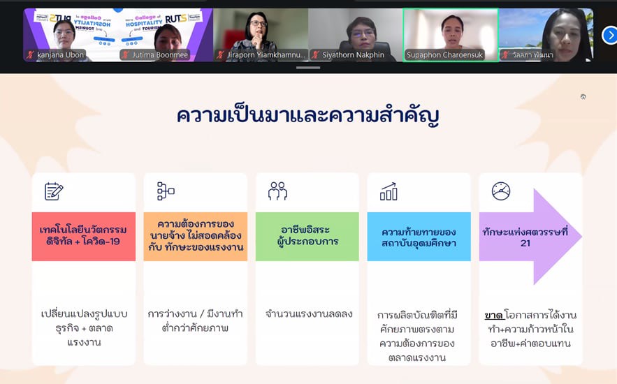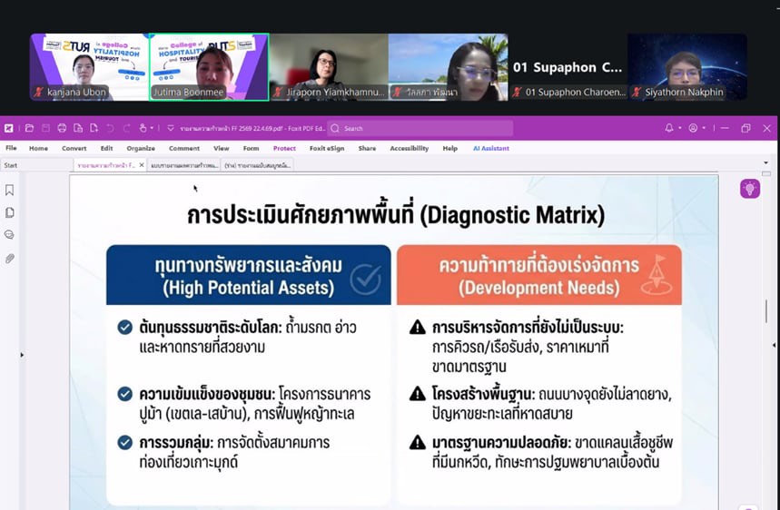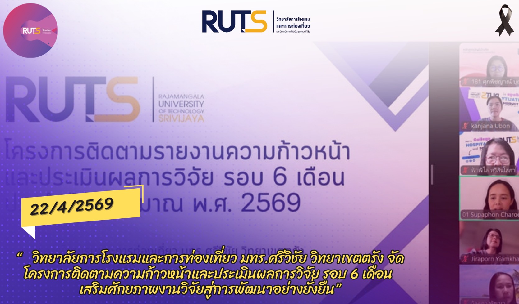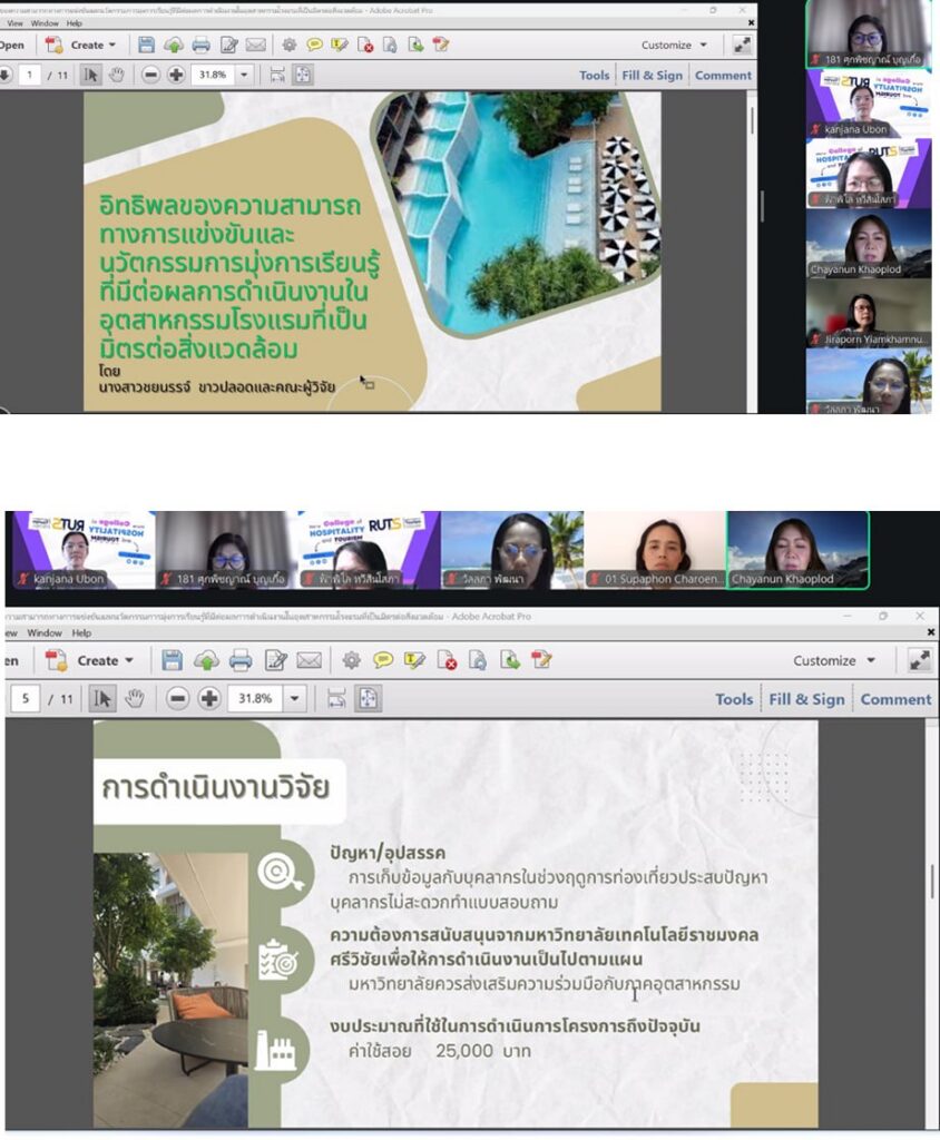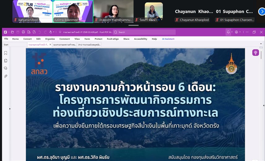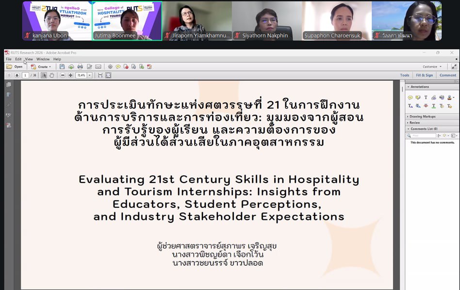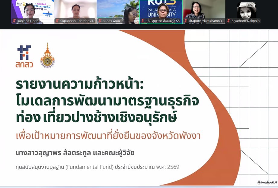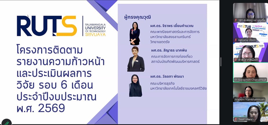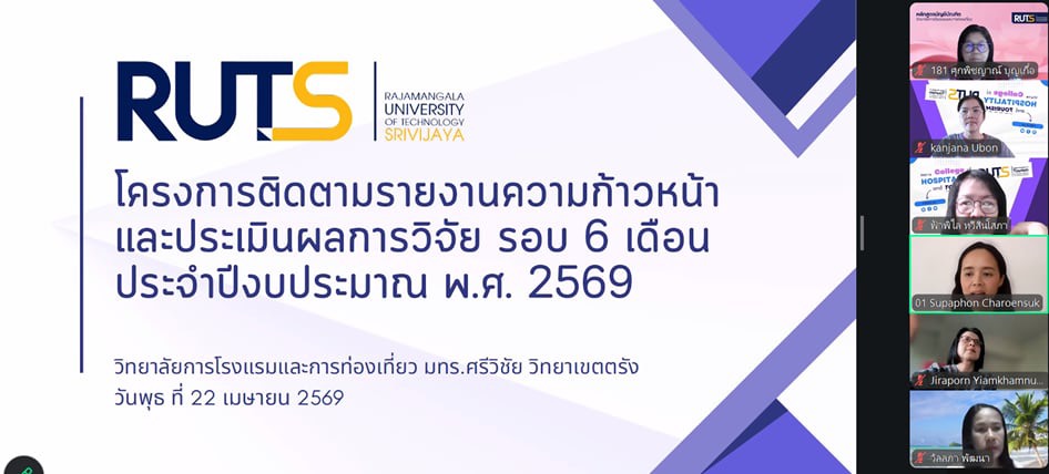 วันที่ 22 เมษายน 2569 วิทยาลัยการโรงแรมและการท่องเที่ยว มหาวิทยาลัยเทคโนโลยีราชมงคลศรีวิชัย วิทยาเขตตรัง จัดโครงการติดตามรายงานความก้าวหน้าและประเมินผลการวิจัย รอบ 6 เดือน เพื่อติดตามความก้าวหน้าในการดำเนินโครงการวิจัย งบประมาณสนับสนุนงานมูลฐาน (Fundamental Fund : FF) และงบประมาณเงินรายได้ ประจำปีงบประมาณ 2569 ผ่านระบบออนไลน์ เพื่อกำกับ ติดตาม และส่งเสริมการดำเนินงานวิจัยของคณาจารย์ให้เป็นไปตามแผนงานอย่างมีประสิทธิภาพ ในการนี้ ได้รับเกียรติจาก ผู้ช่วยศาสตราจารย์สุภาพร เจริญสุข หัวหน้าหน่วยวิจัยและพัฒนา กล่าวรายงานวัตถุประสงค์ของโครงการ พร้อมด้วย ผู้ช่วยศาสตราจารย์ฟ้าฟีไล ทวีสินโสภา ผู้อำนวยการวิทยาลัยการโรงแรมและการท่องเที่ยว กล่าวเปิดโครงการและให้โอวาทแก่คณาจารย์นักวิจัย ภายในกิจกรรมมีการนำเสนอรายงานความก้าวหน้าผลงานวิจัยของคณาจารย์อย่างต่อเนื่อง โดยเริ่มจากโครงการวิจัยเรื่องอิทธิพลของความสามารถทางการแข่งขันและนวัตกรรมการมุ่งการเรียนรู้ที่มีต่อผลการดำเนินงานในอุตสาหกรรมโรงแรมที่เป็นมิตรต่อสิ่งแวดล้อม นำเสนอโดย ดร.ชยนรรจ์ ขาวปลอด ต่อด้วย โครงการวิจัยเรื่องการพัฒนากิจกรรมการท่องเที่ยวเชิงประสบการณ์ทางทะเลเพื่อความยั่งยืน ภายใต้กรอบเศรษฐกิจสีน้ำเงินในพื้นที่เกาะมุกด์ จังหวัดตรัง นำเสนอโดย ผู้ช่วยศาสตราจารย์ ดร.จุติมา บุญมี โครงการวิจัยเรื่องการประเมินทักษะแห่งศตวรรษที่ 21 ในการฝึกงานด้านการบริการและการท่องเที่ยว : มุมมองจากผู้สอน การรับรู้ของผู้เรียน และความต้องการของผู้มีส่วนได้ส่วนเสียในภาคอุตสาหกรรม นำเสนอโดย ผู้ช่วยศาสตราจารย์สุภาพร เจริญสุข และโครงการวิจัยเรื่องโมเดลการพัฒนามาตรฐานธุรกิจท่องเที่ยวปางช้างเชิงอนุรักษ์เพื่อเป้าหมายการพัฒนาที่ยั่งยืน จังหวัดพังงา นำเสนอโดย ดร.สุญาพร ส้อตระกูล ซึ่งมุ่งศึกษาปัจจัยสำคัญที่ส่งผลต่อศักยภาพการแข่งขันของธุรกิจโรงแรมในบริบทการพัฒนาที่ยั่งยืน ภายหลังการนำเสนอแต่ละโครงการ ได้เปิดเวทีถาม–ตอบ แลกเปลี่ยนความคิดเห็น และรับฟังข้อเสนอแนะจากคณะกรรมการผู้ทรงคุณวุฒิ เพื่อพัฒนางานวิจัยให้มีความสมบูรณ์ สามารถนำไปใช้ประโยชน์ได้อย่างเป็นรูปธรรม ทั้งในเชิงวิชาการและการพัฒนาชุมชนต่อไป การจัดโครงการครั้งนี้สะท้อนถึงความมุ่งมั่นของวิทยาลัยการโรงแรมและการท่องเที่ยว ในการผลักดันงานวิจัยให้เป็นกลไกสำคัญในการสร้างองค์ความรู้ใหม่ ต่อยอดสู่การพัฒนาพื้นที่ เศรษฐกิจ และอุตสาหกรรมการท่องเที่ยวอย่างยั่งยืนต่อไป ภาพ : นางสาวกาญจน