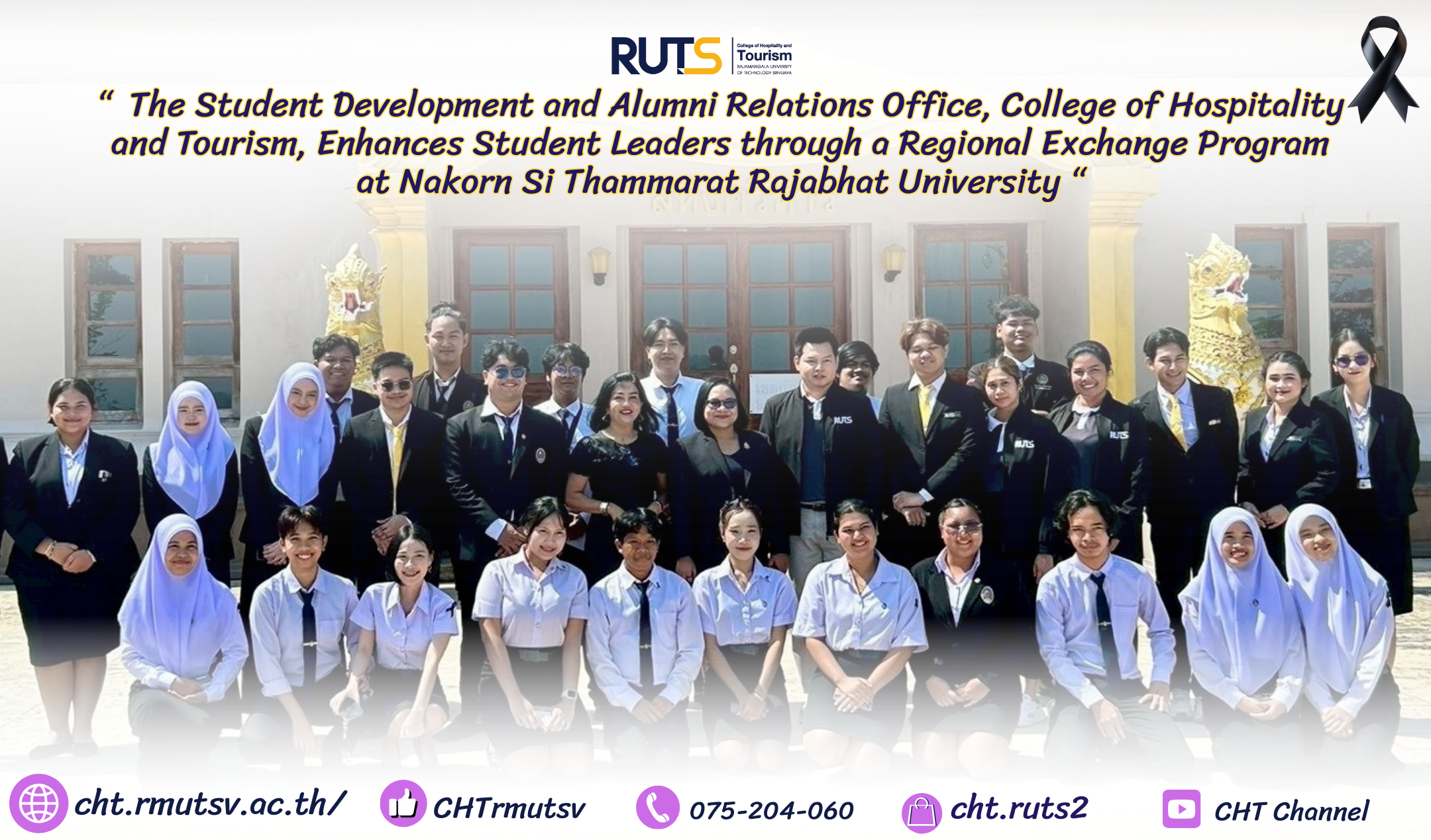 On December 3–4, 2025, at Nakorn Si Thammarat Rajabhat University (NSTRU), the Student Development and Alumni Relations Office of the College of Hospitality and Tourism (CHT), Rajamangala University of Technology Srivijaya (RUTS), Trang Campus, under the supervision of Asst. Prof. Fapilai Taweesinsopa, Director of CHT, assigned Dr. Dusitporn Hokta, Deputy Director for Student Development, to lead 20 students and staff in participating in a student leadership exchange program with student leaders from various regional institutions.