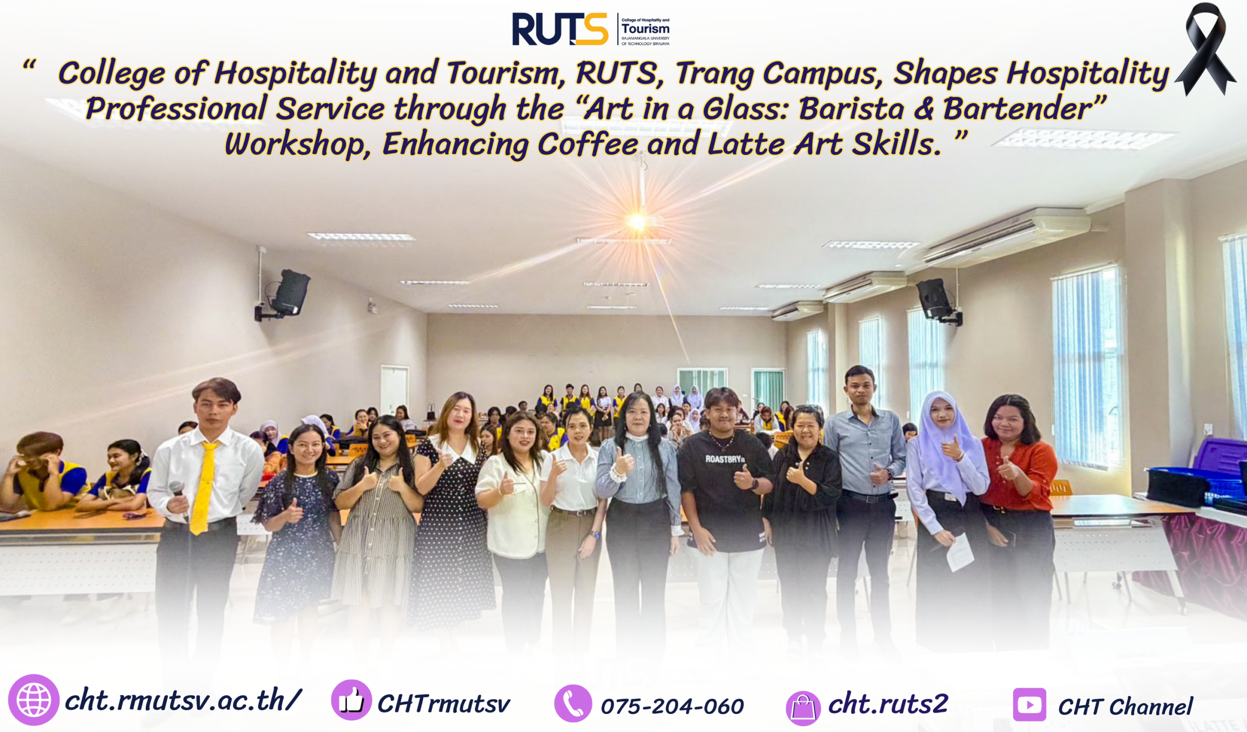 On January 28, 2026, at the Ya-Ta-Lay Meeting Room, the College of Hospitality and Tourism (CHT), Rajamangala University of Technology Srivijaya (RUTS), Trang Campus, organized “Art in a Glass: Barista & Bartender”, Basic Coffee Brewing and Latte Art Workshop, which is a part of The Professional Skill Training and Capacity Development Project in Tourism and Hospitality. The activity aimed to strengthen students’ knowledge and practical expertise, enabling them to further develop necessary competencies for future careers in the tourism and hospitality industry with professionalism.