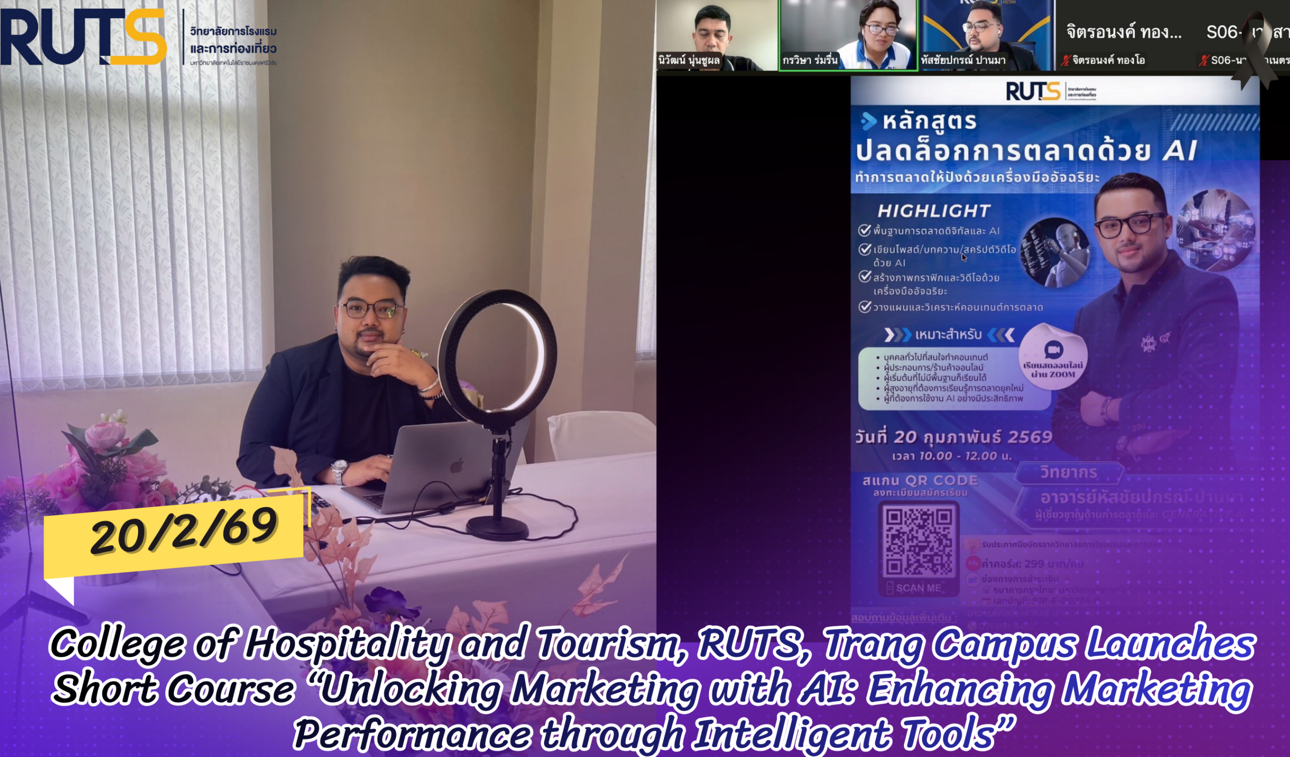 On 20 February 2026, the College of Hospitality and Tourism, Rajamangala University of Technology Srivijaya, Trang Campus, organized a short course entitled “Unlocking Marketing with AI: Enhancing Marketing Performance through Intelligent Tools.” The program aimed to advance knowledge and strengthen competencies in digital marketing alongside the effective application of Artificial Intelligence (AI) technologies. The training was offered to interested participants, including school students, university students, entrepreneurs, and members of the general public seeking to enhance their marketing capabilities in the digital era.