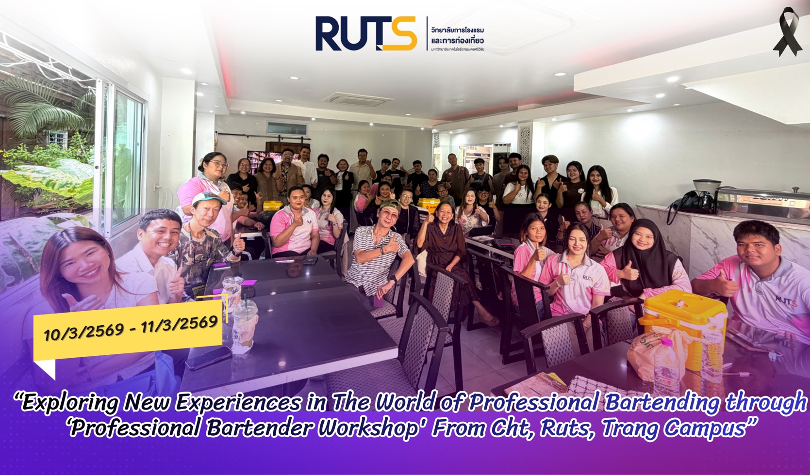 The College of Hospitality and Tourism (CHT), Rajamangala University of Technology Srivijaya (RUTS), Trang Campus, organized the ‘From Crisis to Adaptation: Developing High-Quality Gulf of Thailand–Andaman Marine Tourism through Learning Ecosystems, Modern Management, Technology, and Innovation.’ project through the Professional Bartender Workshop on March 10–11, 2026, at Lay Trang Restaurant 2, Trang. The activity aimed to increase participants’ beverage-mixing skills and service capabilities.